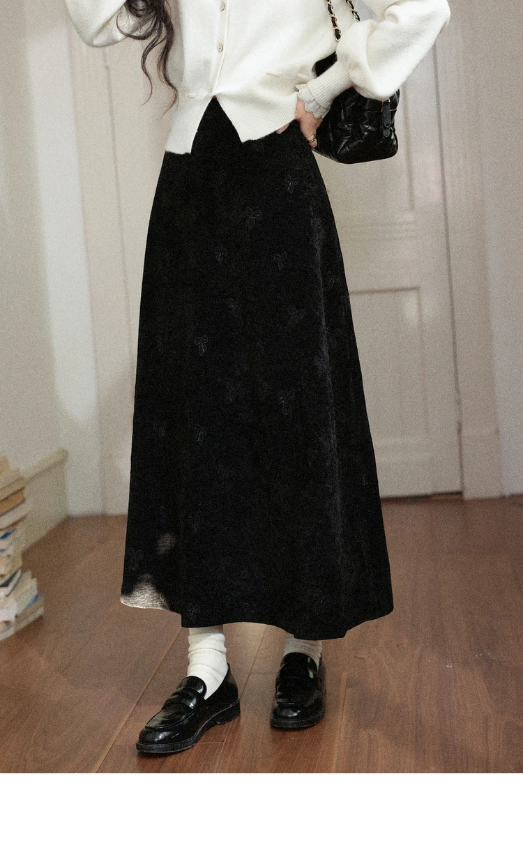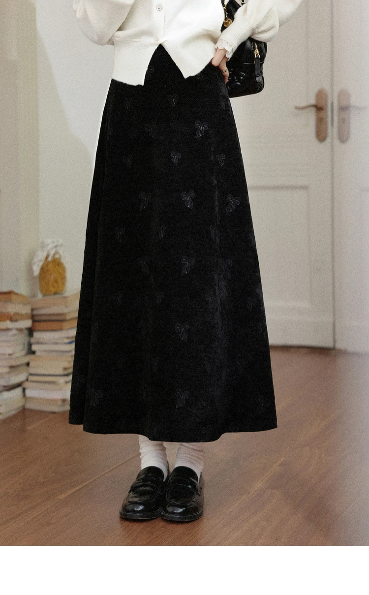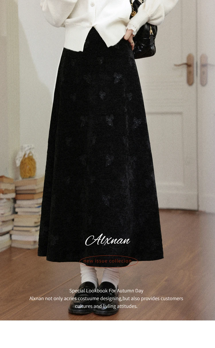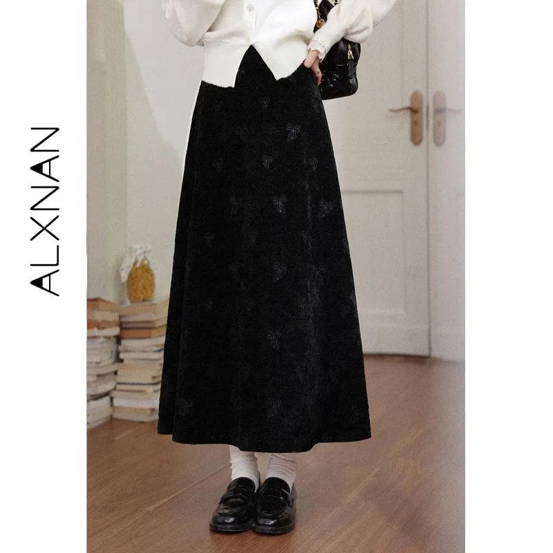 ALXNAN Plus Size Women’s Black Skirt 2025 Fall Winter Casual Elegant Bow Embroidery Long Skirts A-line Female Clothing D58836