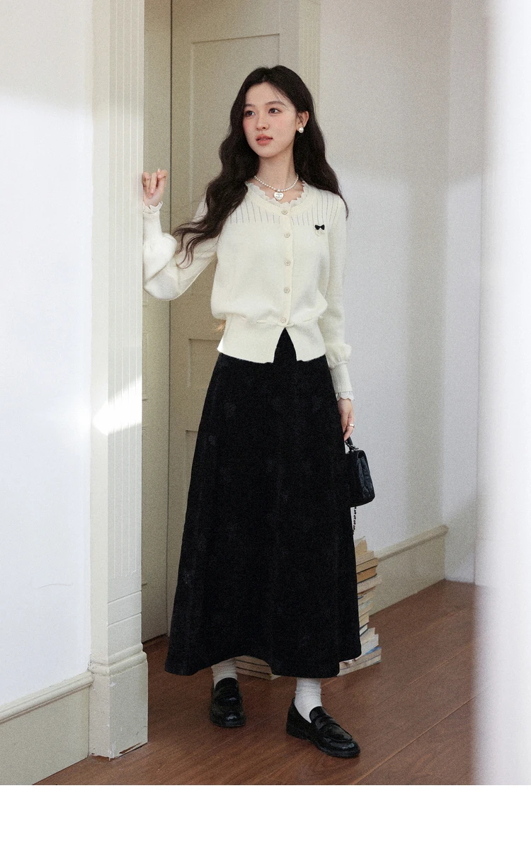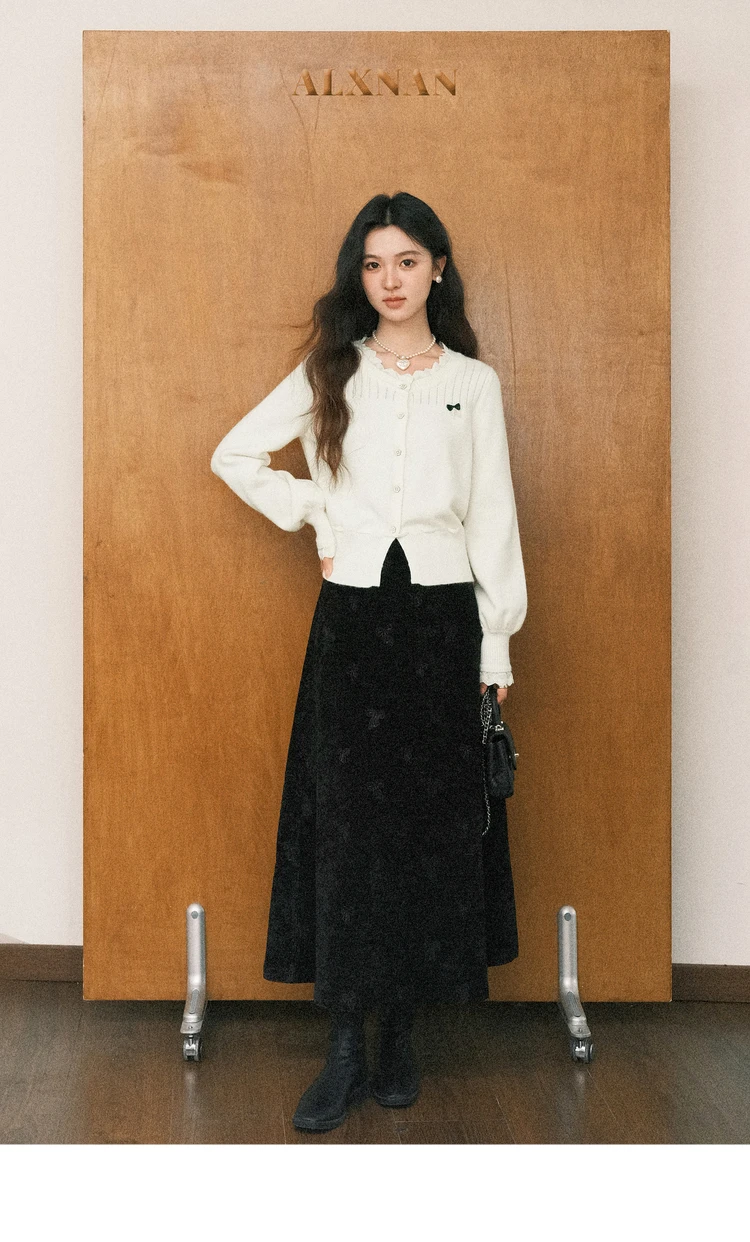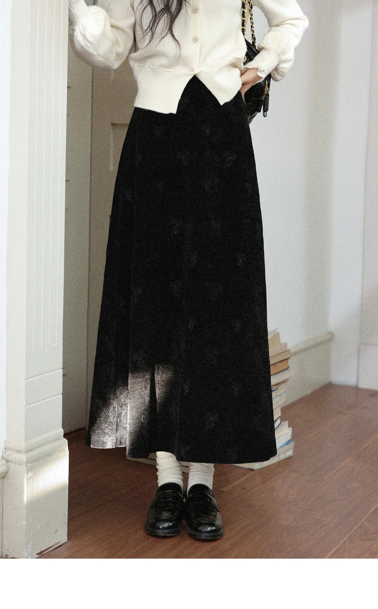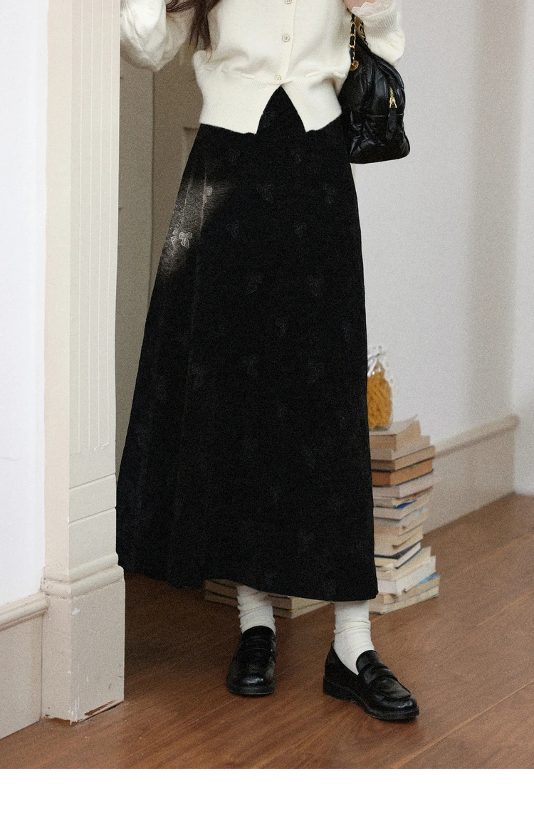 ALXNAN Plus Size Women’s Black Skirt 2025 Fall Winter Casual Elegant Bow Embroidery Long Skirts A-line Female Clothing D58836