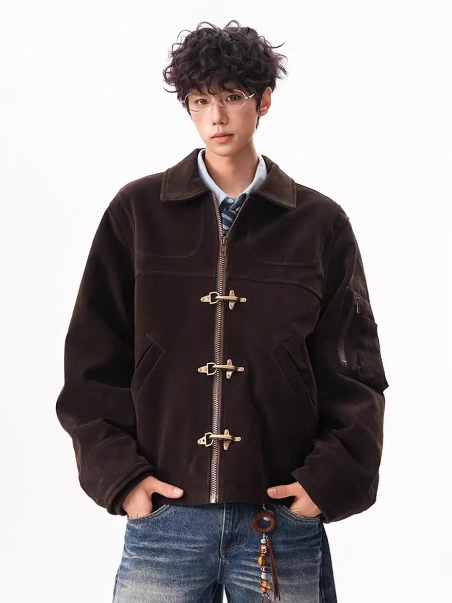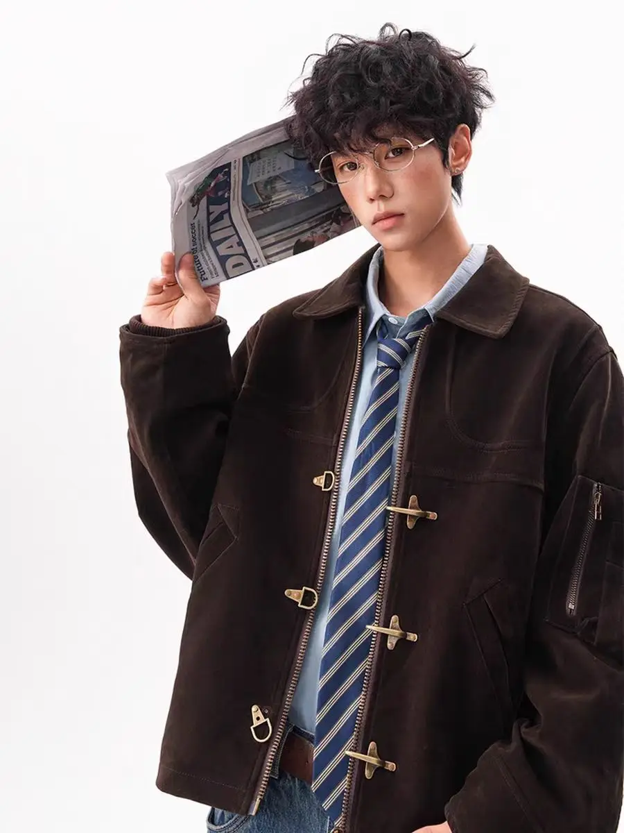 American Brown Patchwork Suede Fabric Jacket Men’s Retro Vintage Autumn And Winter New Korean Style High Street Casual Jackets