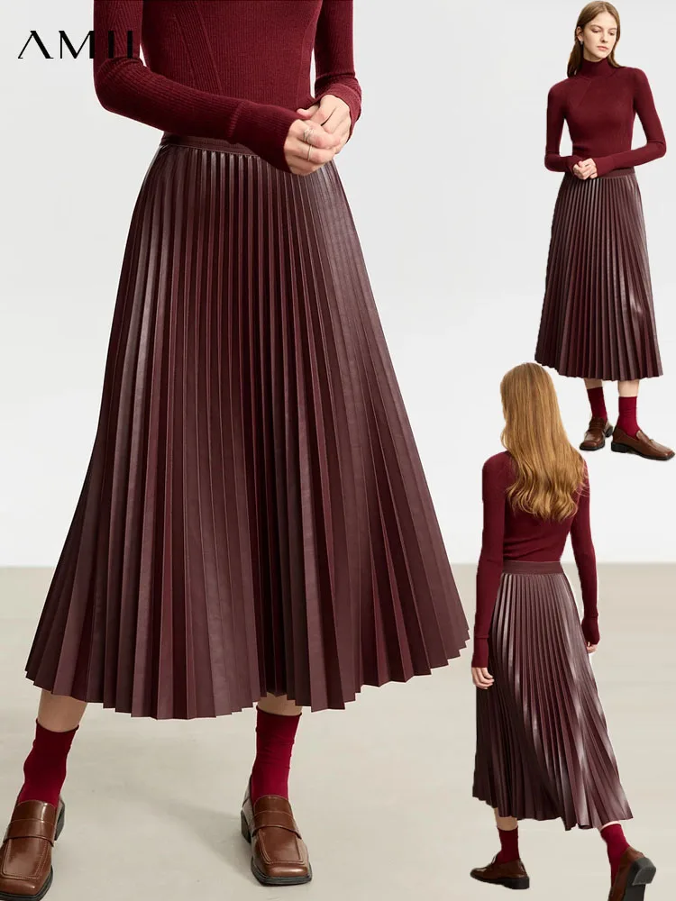 AMII Minimalist Retro Fashion Women Skirts 2024 Winter New A-line Pleated PU Simple Office Lady Leather Skirt Female 12323021