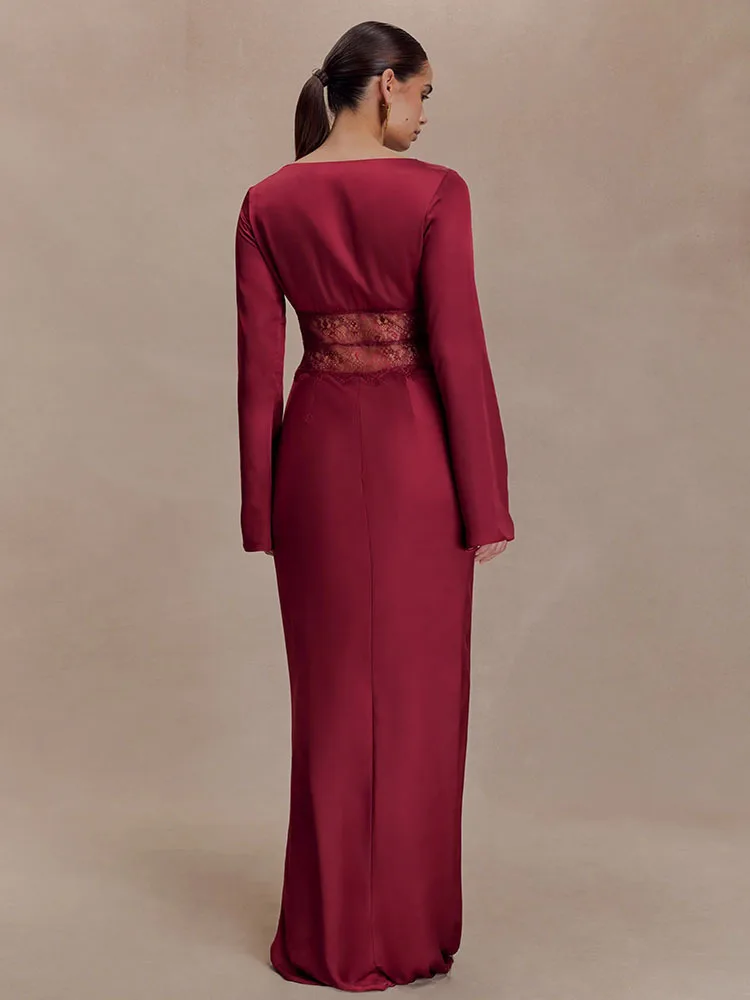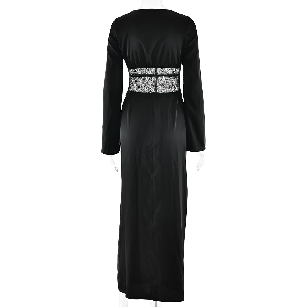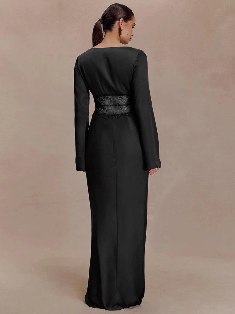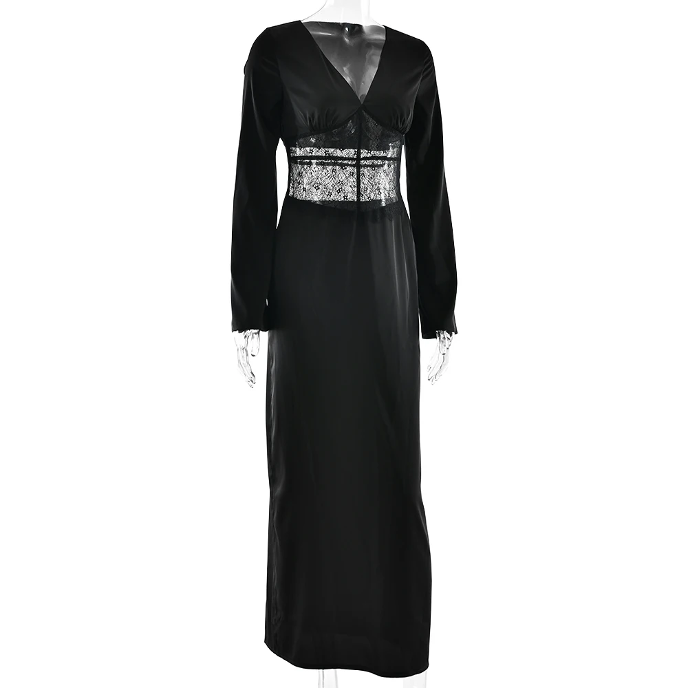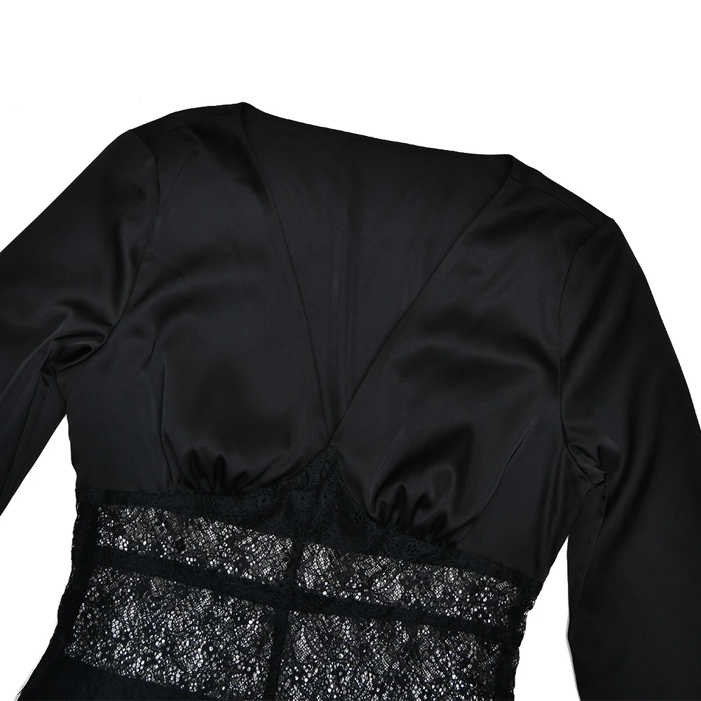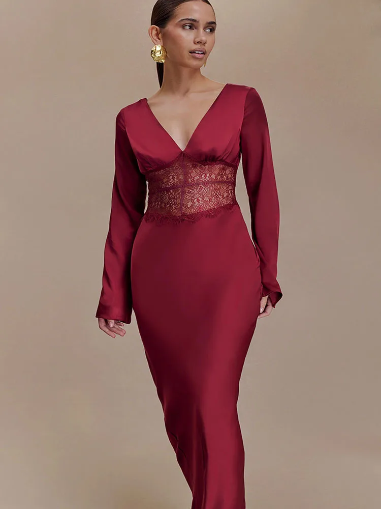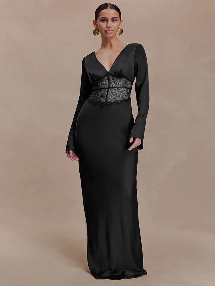 Articat Elegant Long Sleeve Satin Lace Patchwork Party Evening Dress Women Sexy Deep V Bodycon Formal Christmas Wedding Outfit