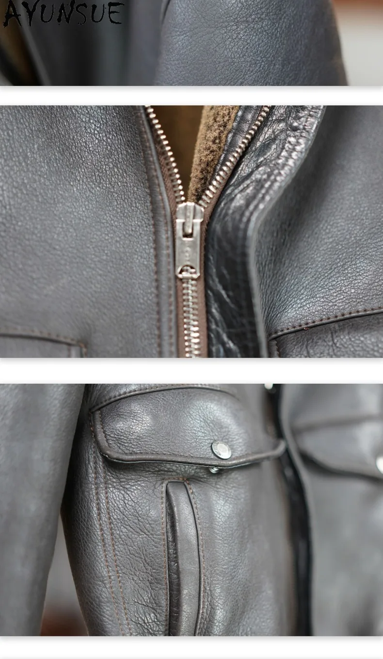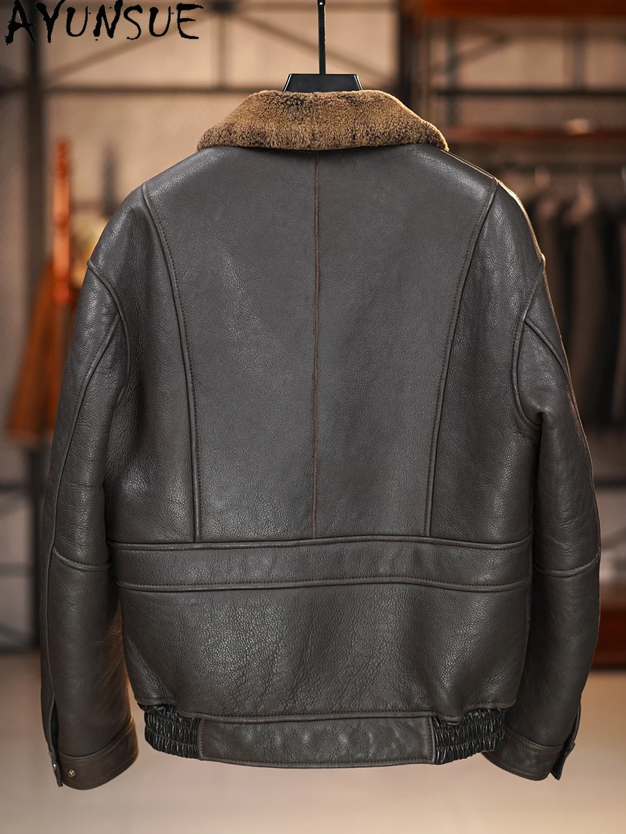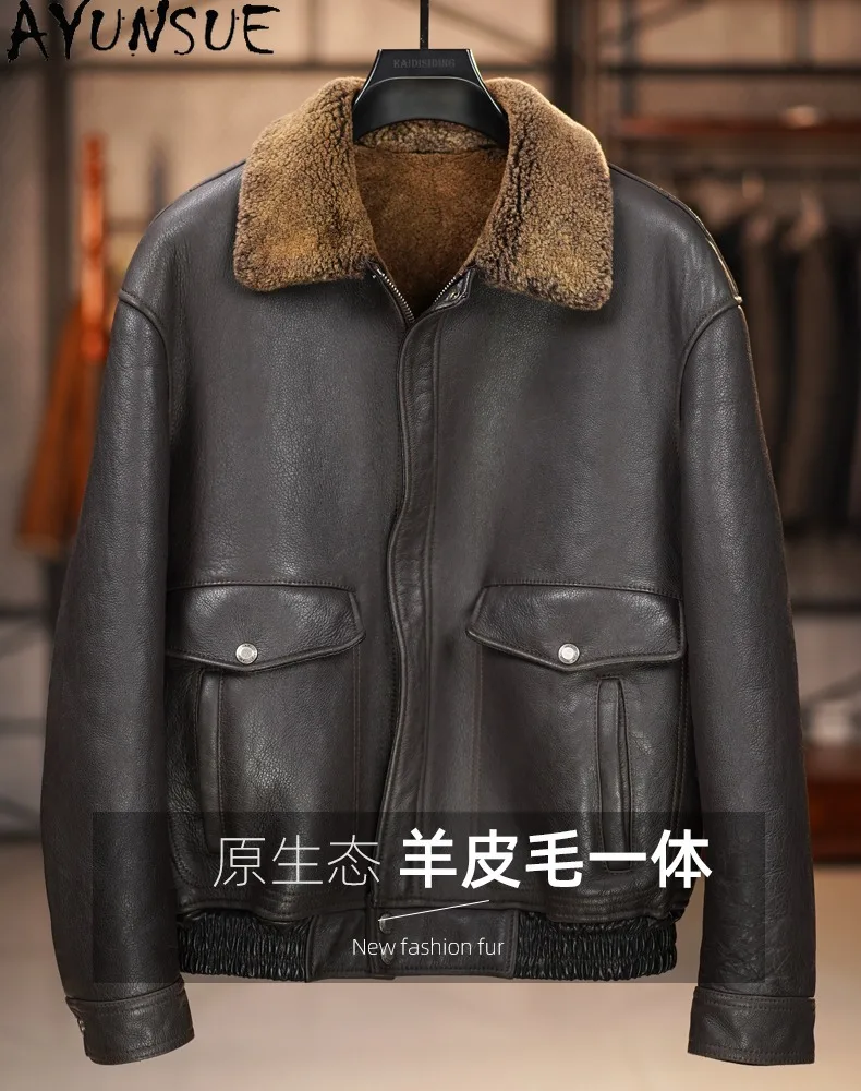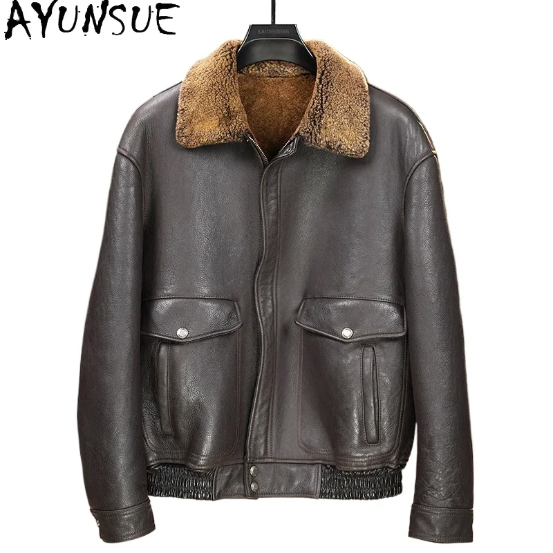 AYUNSUE 100% Genuine Sheepskin Leather Jacket Man Winter Casual Natural Fur Coat Men’s Clothes Warm Dark Brown Leather Fur Coats
