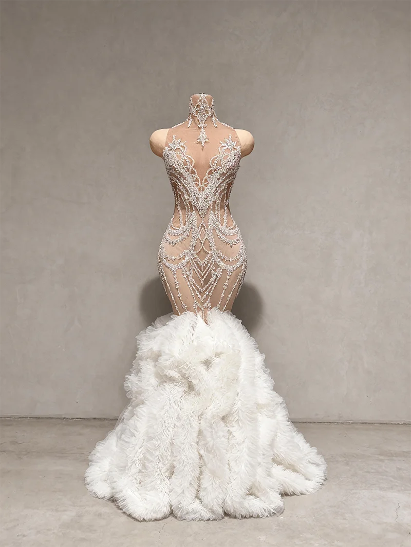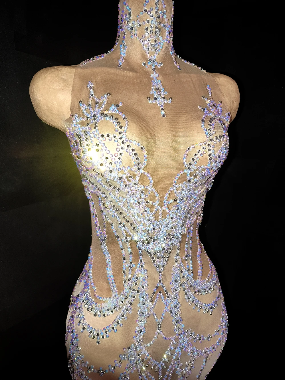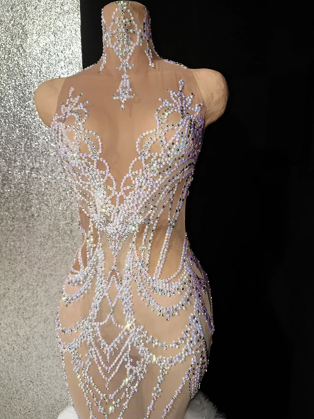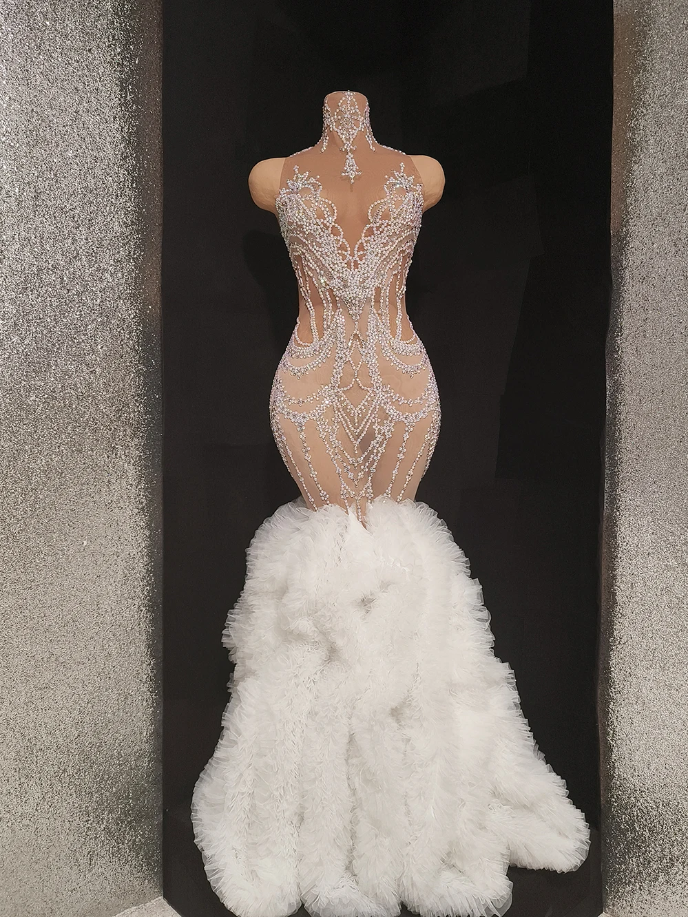 Birthday Celebrate Party Sparkly Rhinestone Evening Gown Sexy Elegant See Through Mesh White Mermaid Dress Long Dress Gongzhu