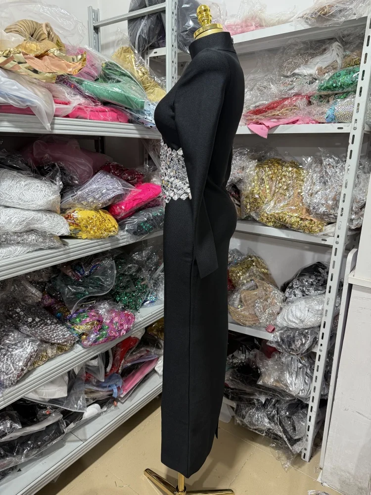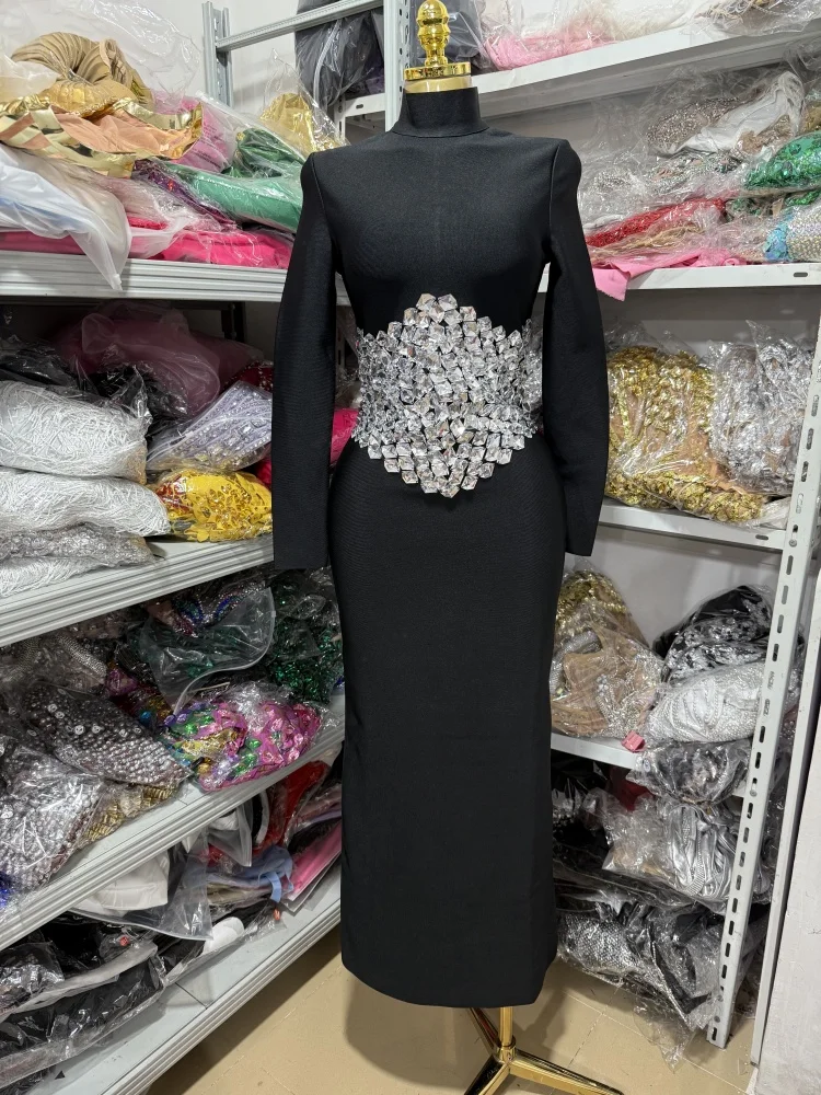 Black Round-Neck, Long-Sleeved, Waist-Cinched, Tight, Diamond-Encrusted, Hip-Hugging, Long Black Dress For Ladies’ Parties Dress