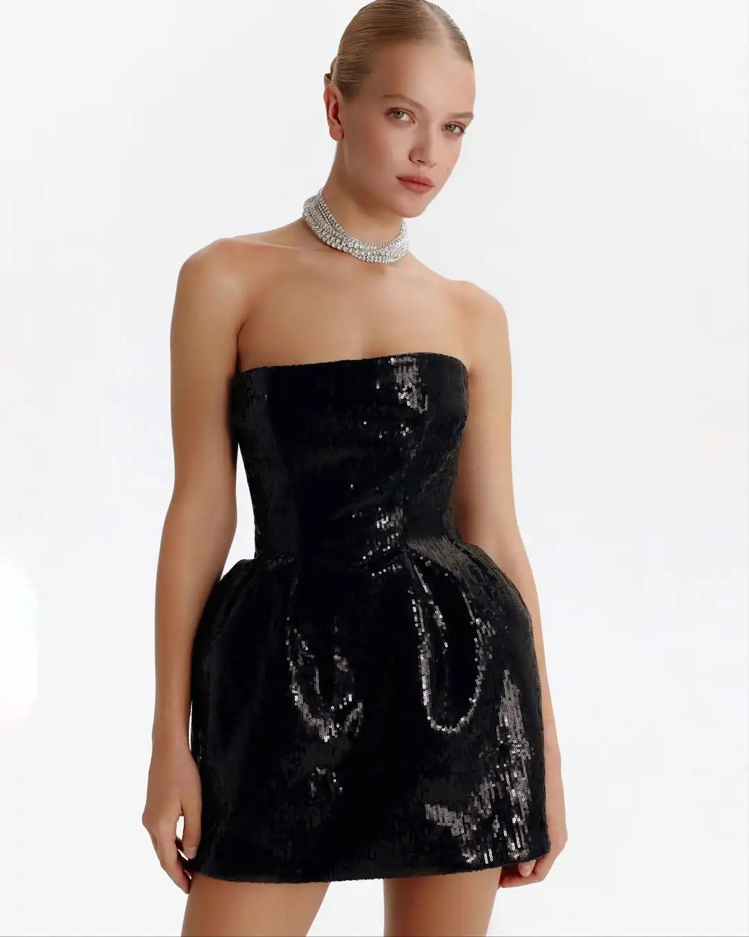 Black Sequin Strapless Mini Cocktail Dress Puffy Sequined Women Party Prom Dress Sparkling Bubble Lace Short Evening Gowns