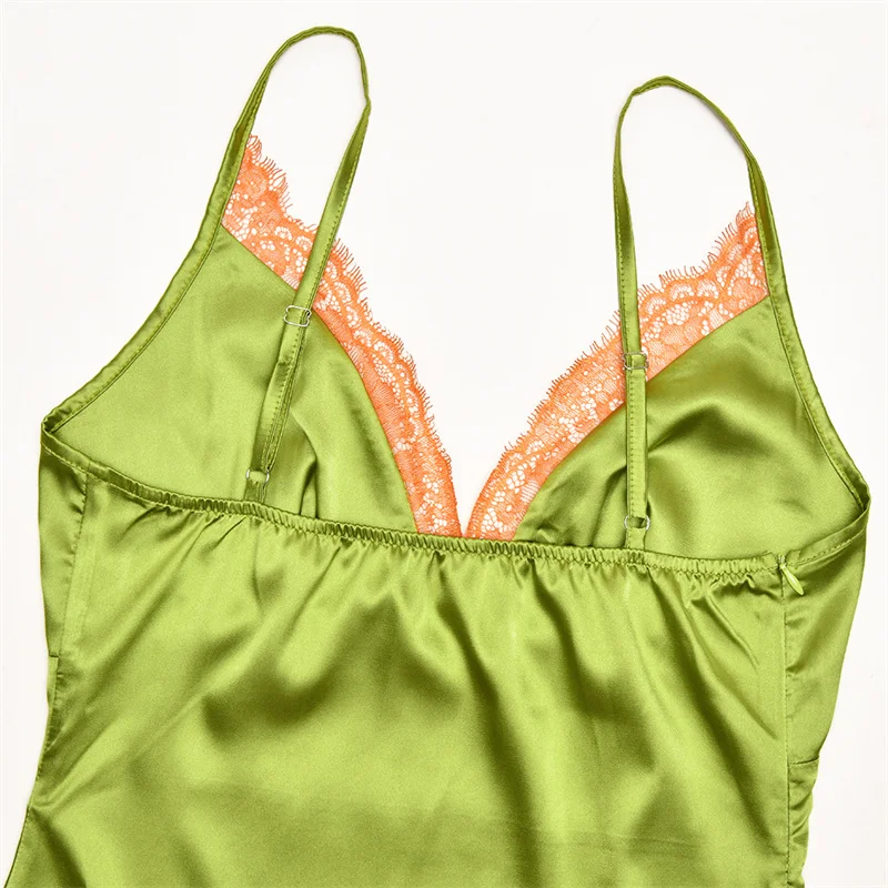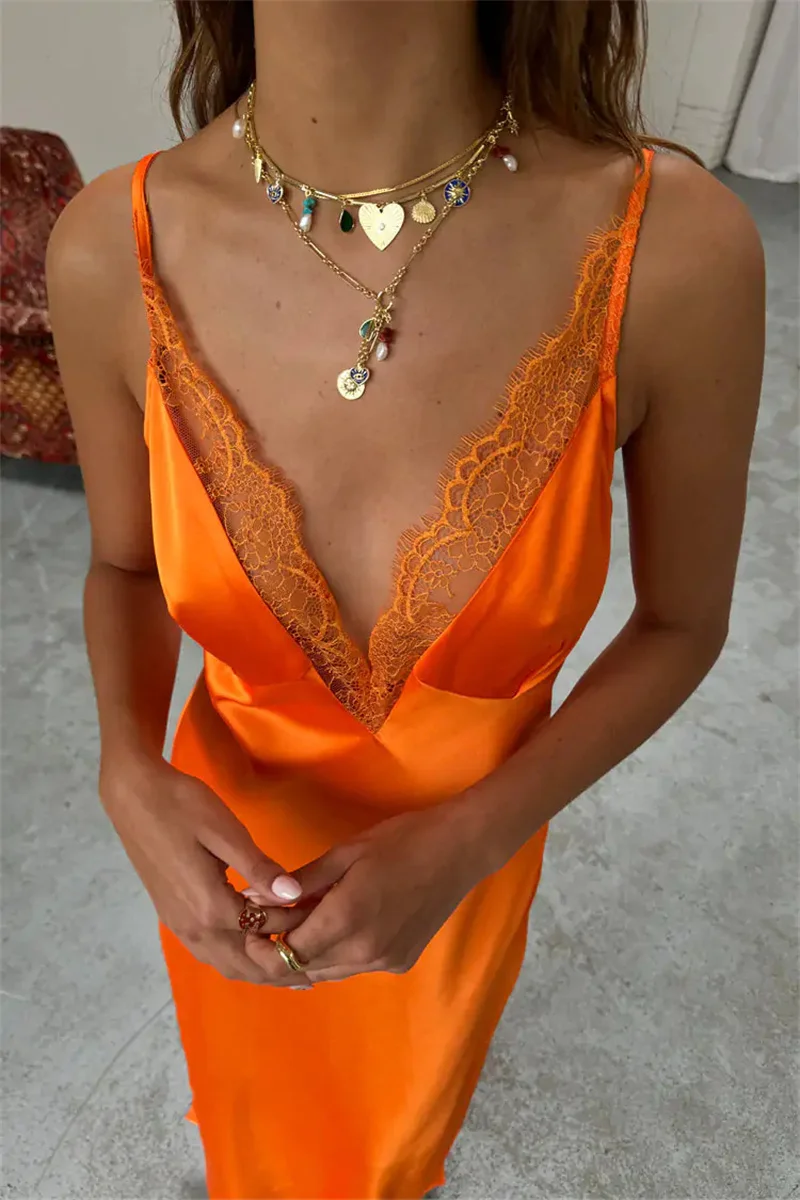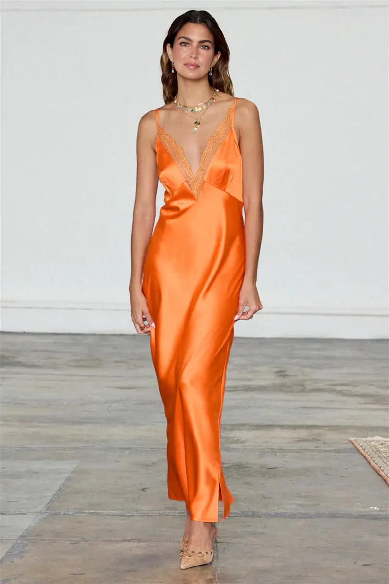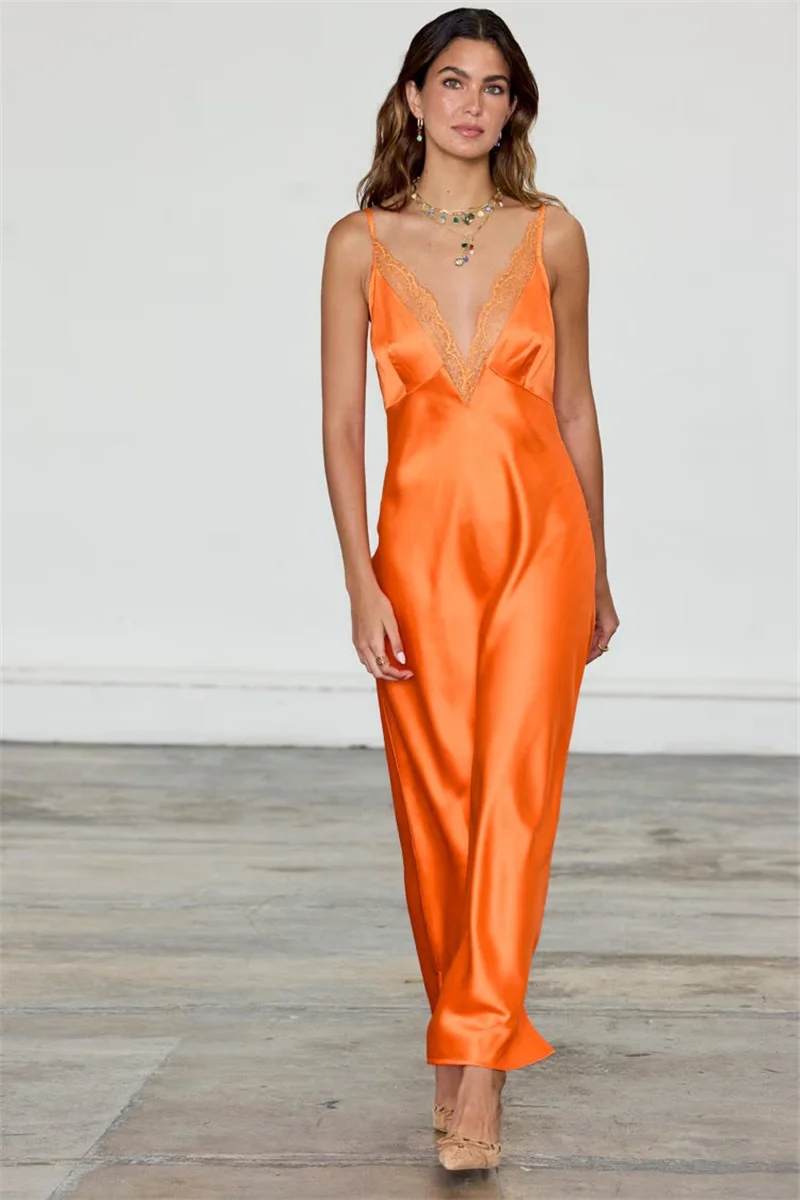Blifanbo Stain Spaghetti Strap Maxi Dress For Women Lace Side V Neck Sexy Sleeveless Backless Patchwork Holiday Dress Elegant