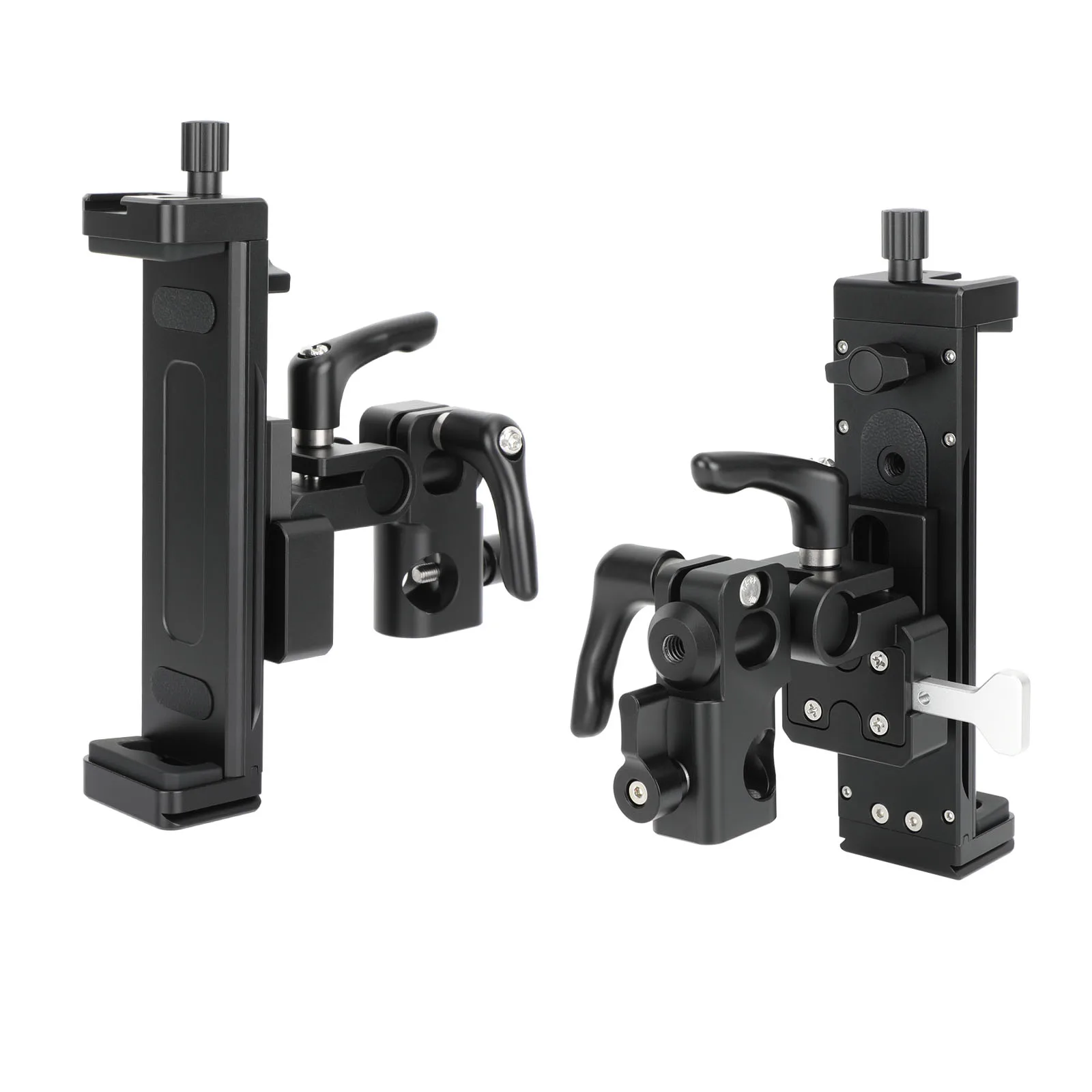 Secure a tablet onto a C-stand or other mount with a 5/8″ baby pin using this Adjustable iPad Tablet Holder with 360° Pan and 5/8″ Pole Mount. The adjustable tablet mount can hold a 7.9 to 12.9″ tablet and features padding to protect the tablet from scratching. There are a cold shoe mount and several 1/4″-20 Threads to add accessories. You can also mount your tablet on a fluid head, tripod, or other rig using the Arca-type base or its 1/4″-20 tripod thread. The bracket can pan and tilt to adjust to your preferred position and create a better view. Quickly mount and unmount you tablet using its quick release V-lock system.