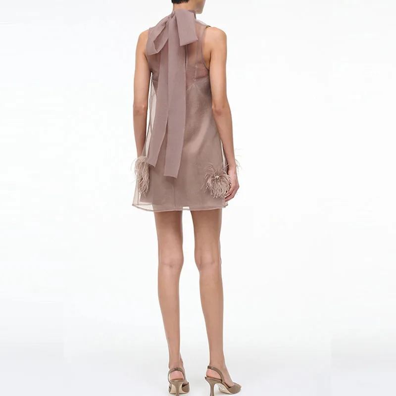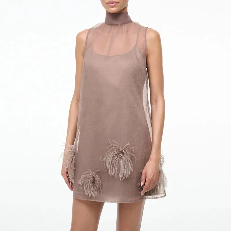 Casual Sleeveless Feather Party Dress Elegant Mesh Splicing Solid A-Line Dress 2025 Women Fashion Half High Collar Short Dress