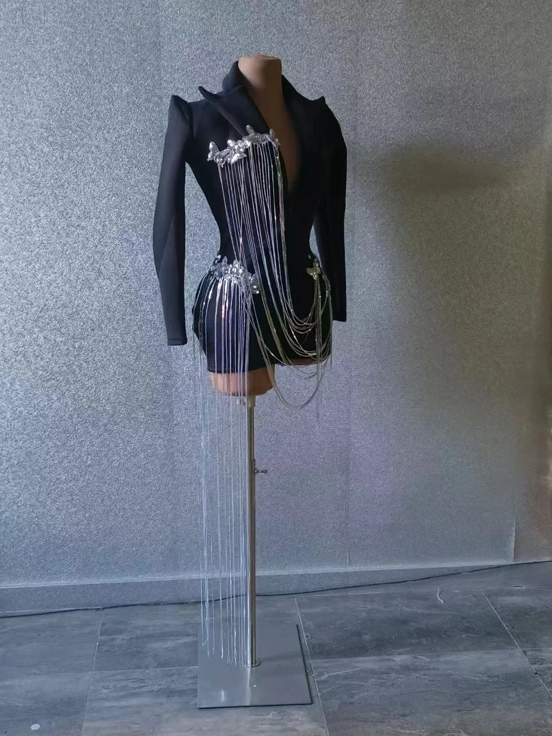 Collar Birthday Evening Party Nightclub Dress Singer Dress Flashing Tassels Chains Mini Dress Black Color Fashion Suit