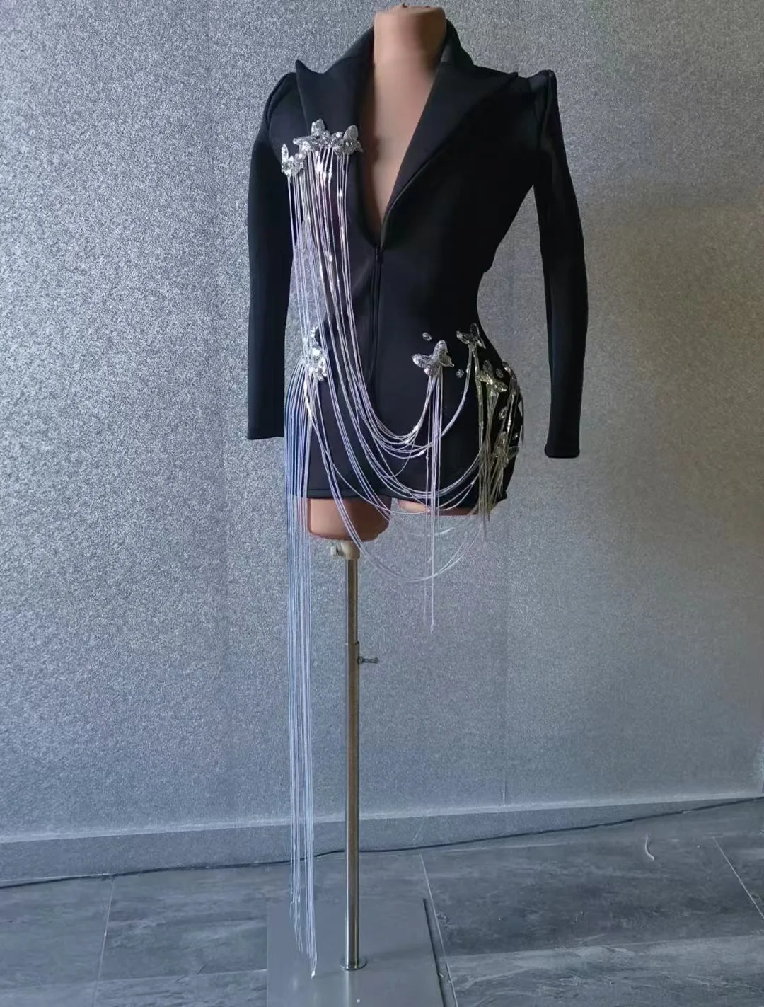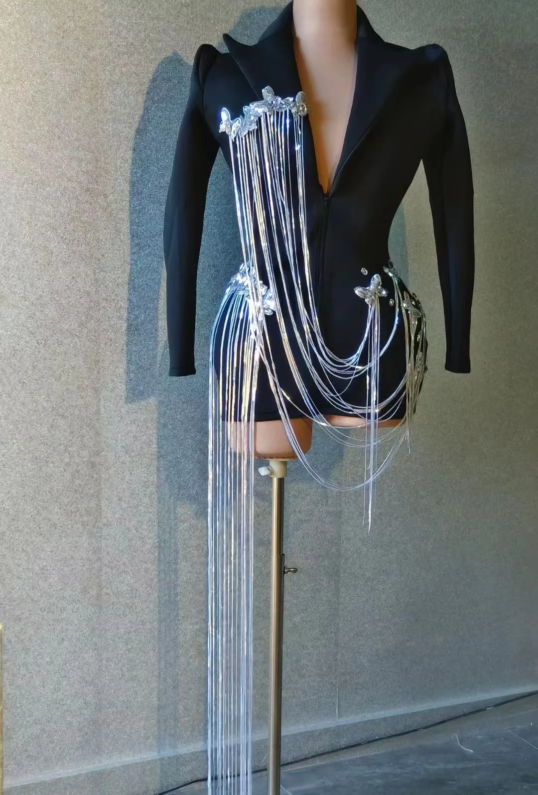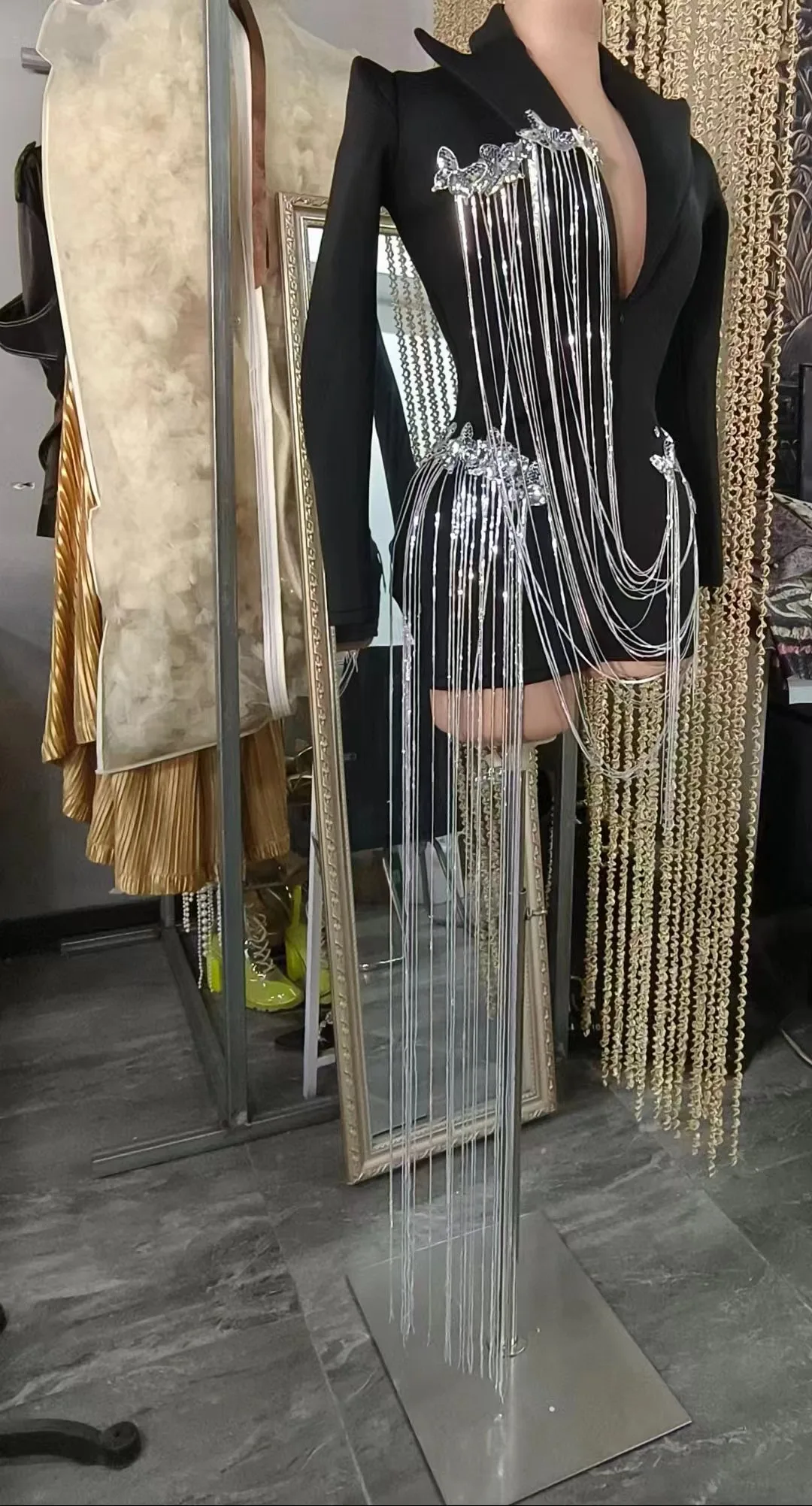 Be the first to review “Collar Birthday Evening Party Nightclub Dress Singer Dress Flashing Tassels Chains Mini Dress Black Color Fashion Suit” Cancel reply
