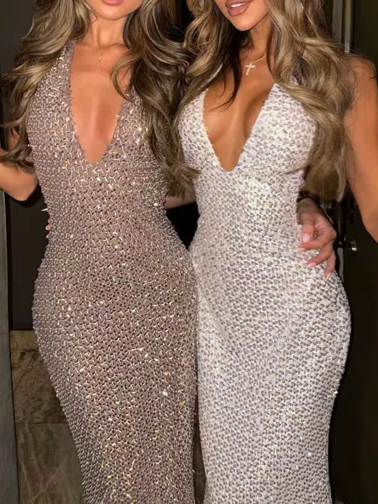 Deep V-neck Sequins Backless Halter Evening Dress Temperament High Waist Slim Wrap Hips Dress Lady Sleeveless Off Shoulder Dress