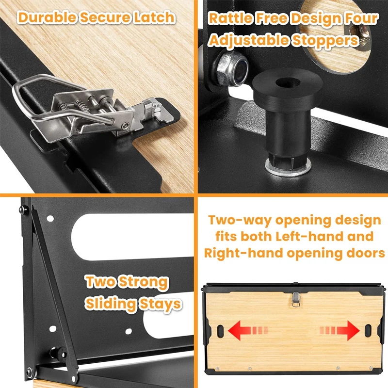 Perfect Design — The strong latch and 4 adjustable stoppers keep the table secure and do not rattle. Quickly and easily open down or fold up to get or save more work and storage space, for food prep or work, for fishing, picnicking, camping, tailgating, taking a lunch break or any outdoor adventures.