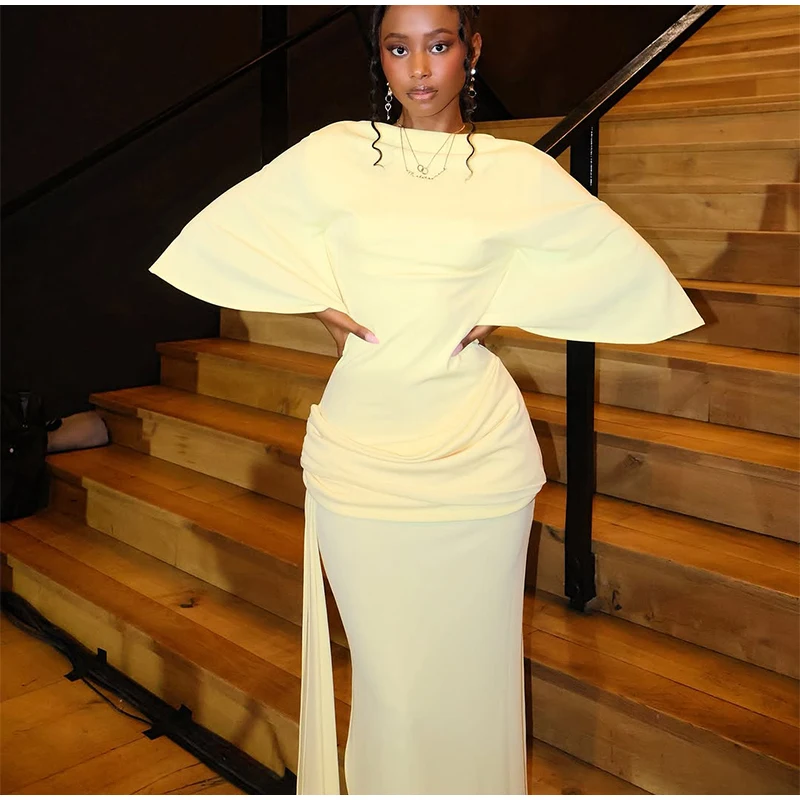 Elegant Backless Pleated Long Dress Women Half Sleeve Slim Slit Ribbon Evening Gown Female 2026 Spring Summer Autumn Lady Robes