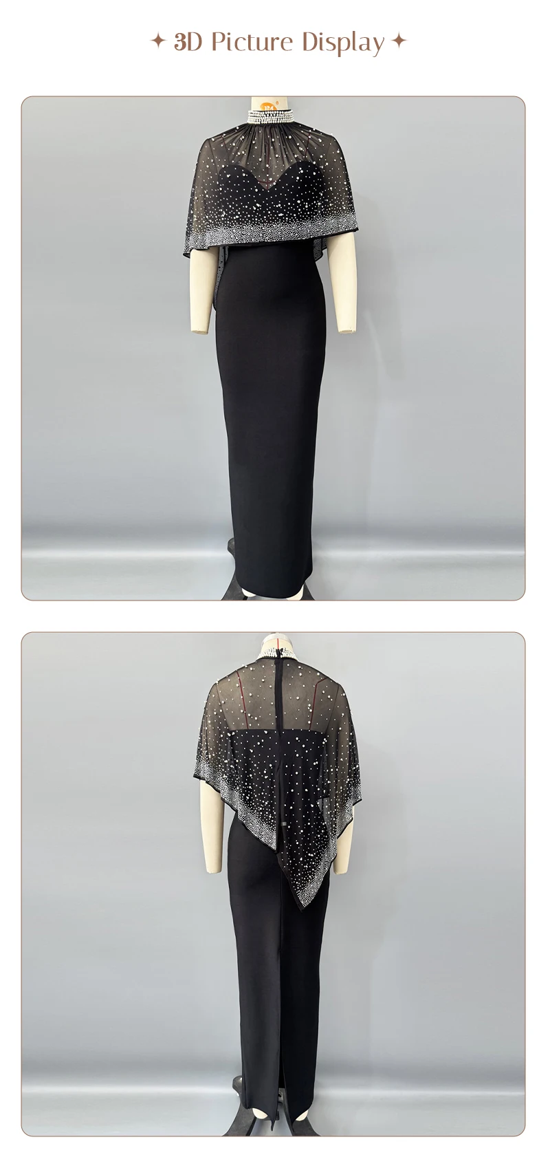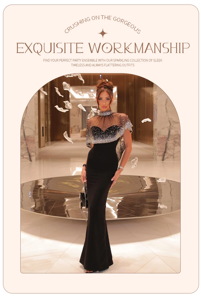The high – neck design is paired with a sheer cape – like overlay on the top, which is lavishly adorned with sparkling rhinestones.