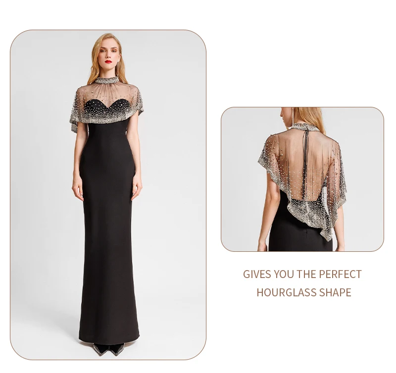 Elegant Black Evening Gown with Sheer Beaded Cape High-Neck Formal Maxi Dress for Women Rhinestone – Embellished Party Dresses