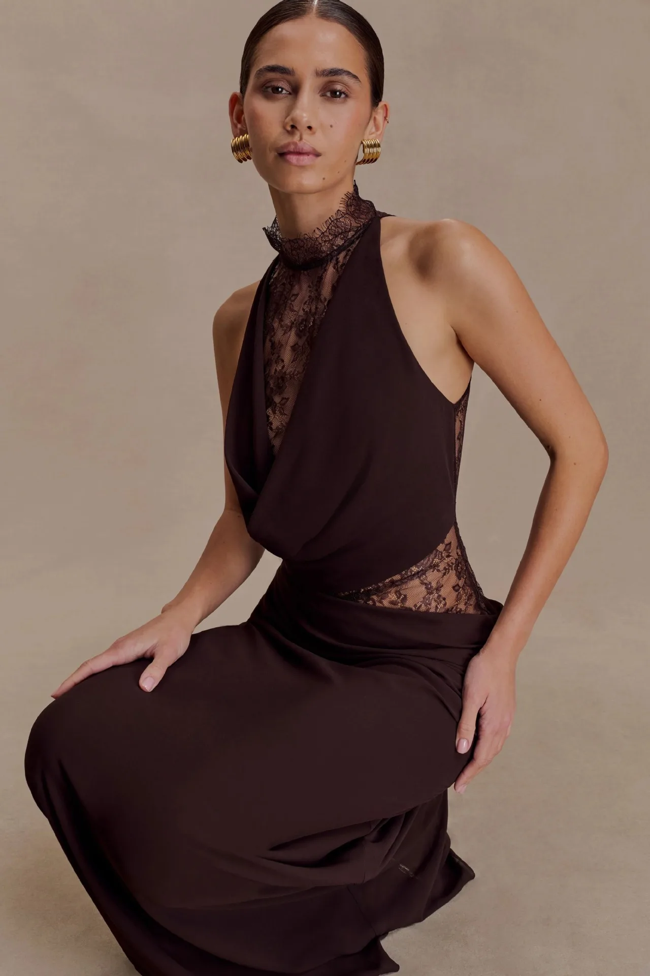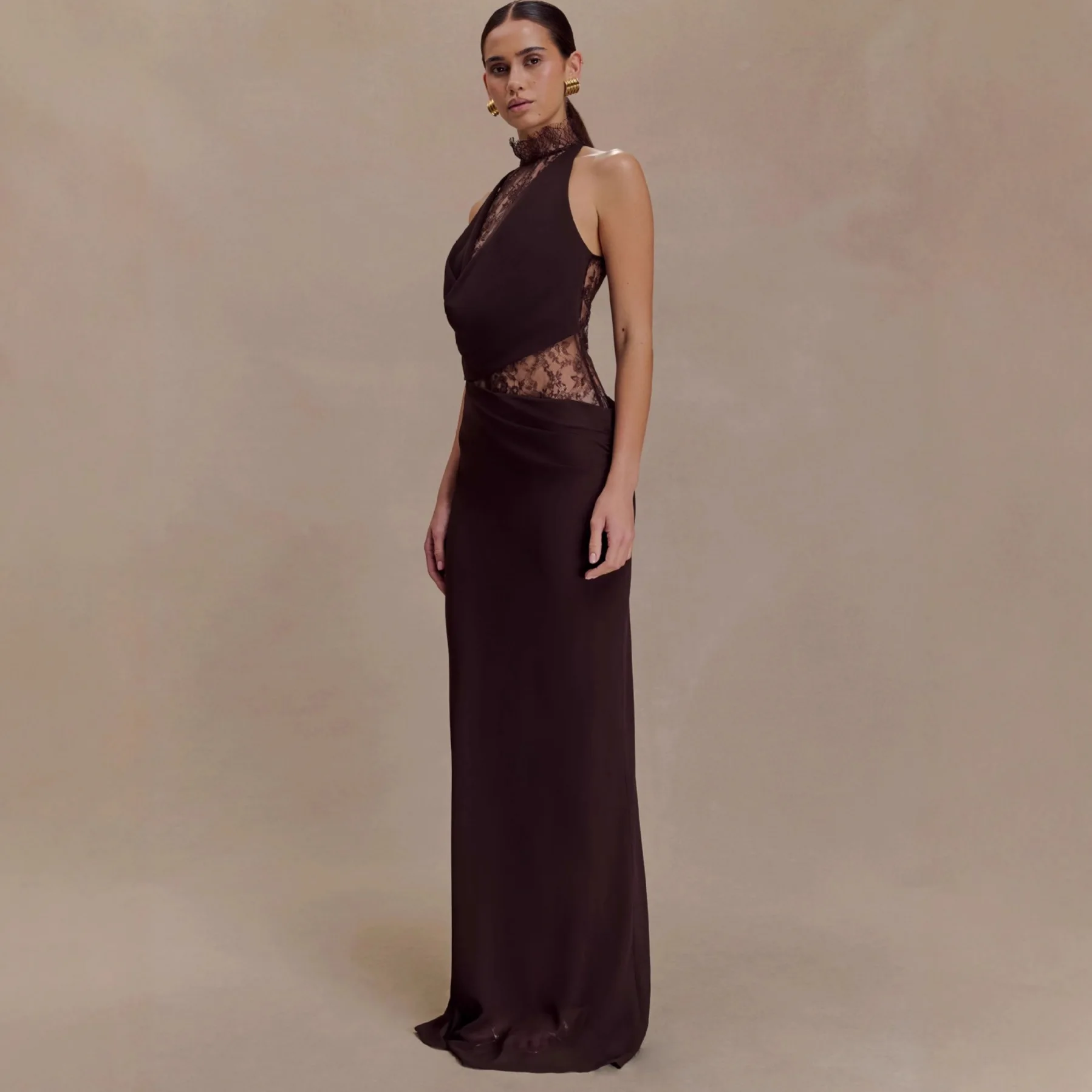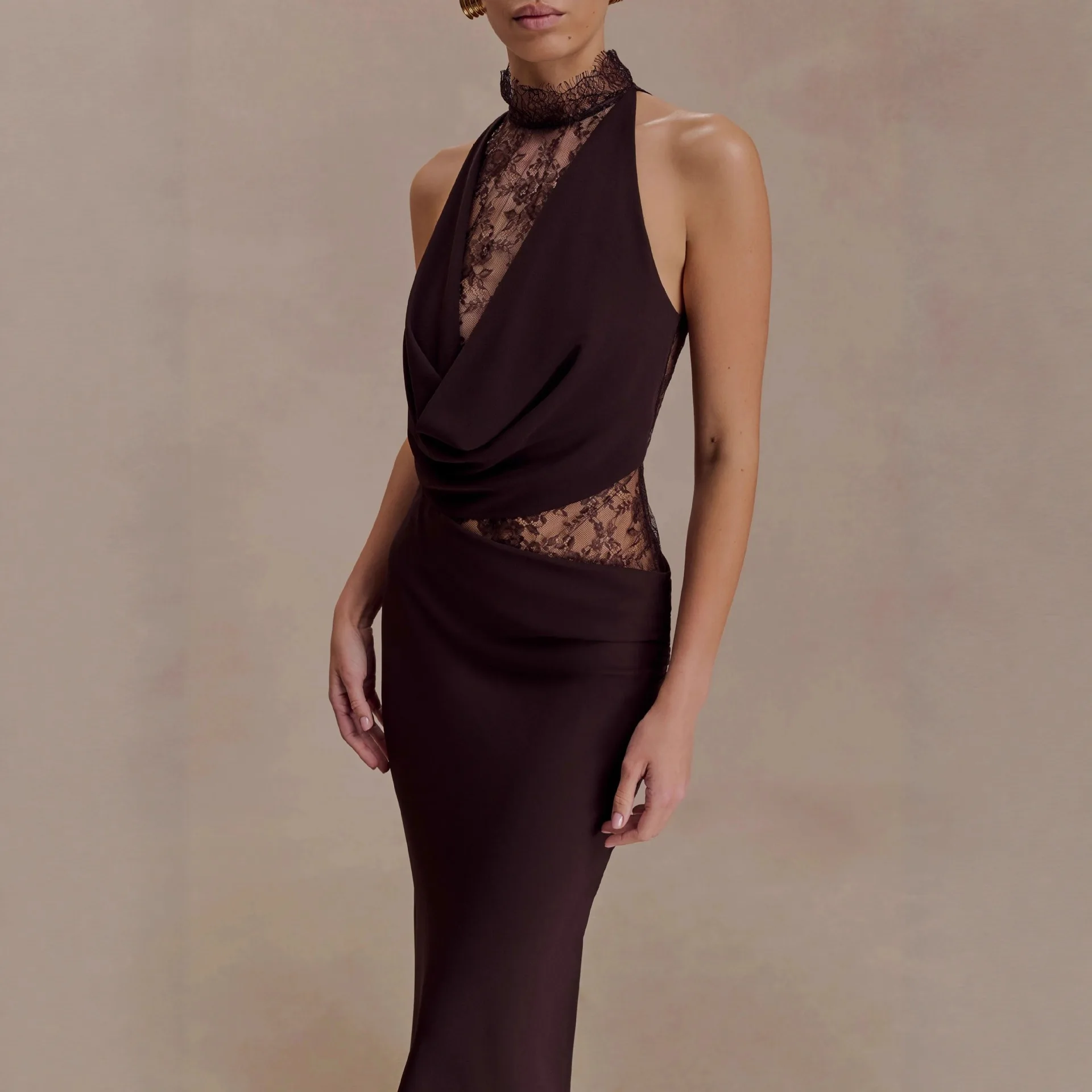 Elegant Red Brown Lace Patchwork Long Dress Women’s Turtleneck Draped Collar Dresses Evening Party Wedding Guest New Year 2026