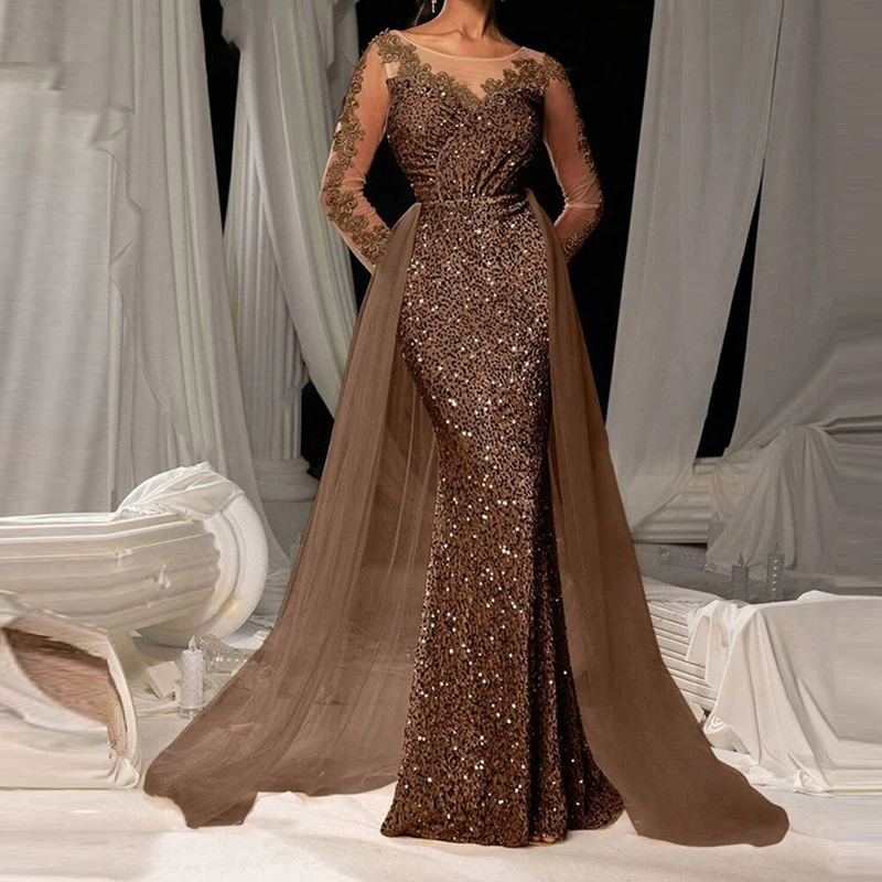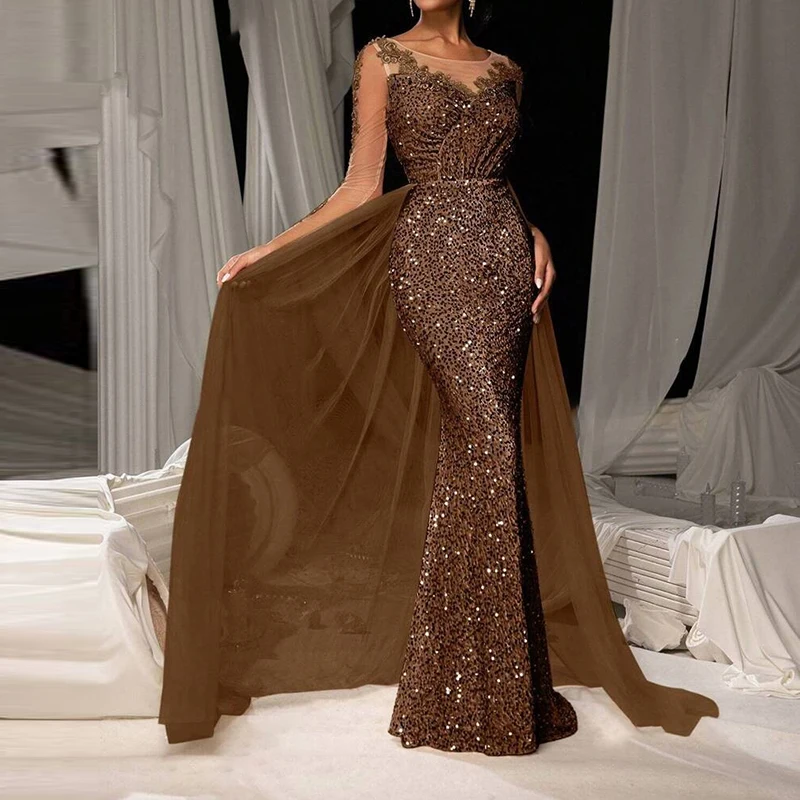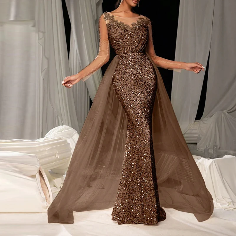 Elegant V-neck Lace Sequin Mesh Spliced Evening Dress Fashion Solid Color High Waist Glitter Dress Luxury Long Sleeve Slim Dress