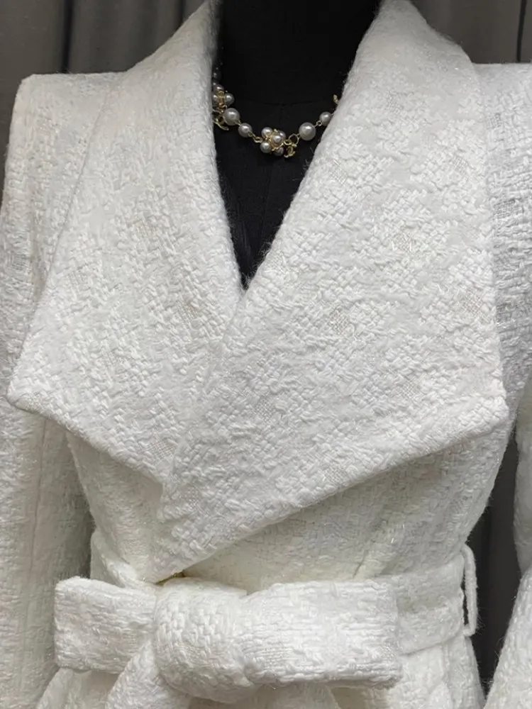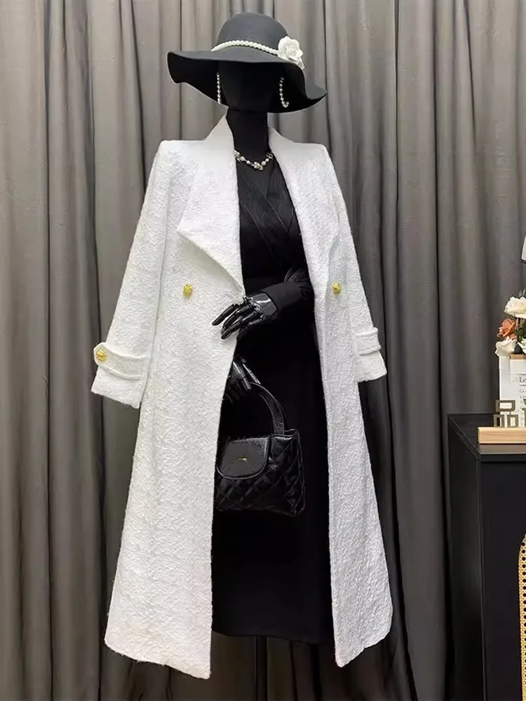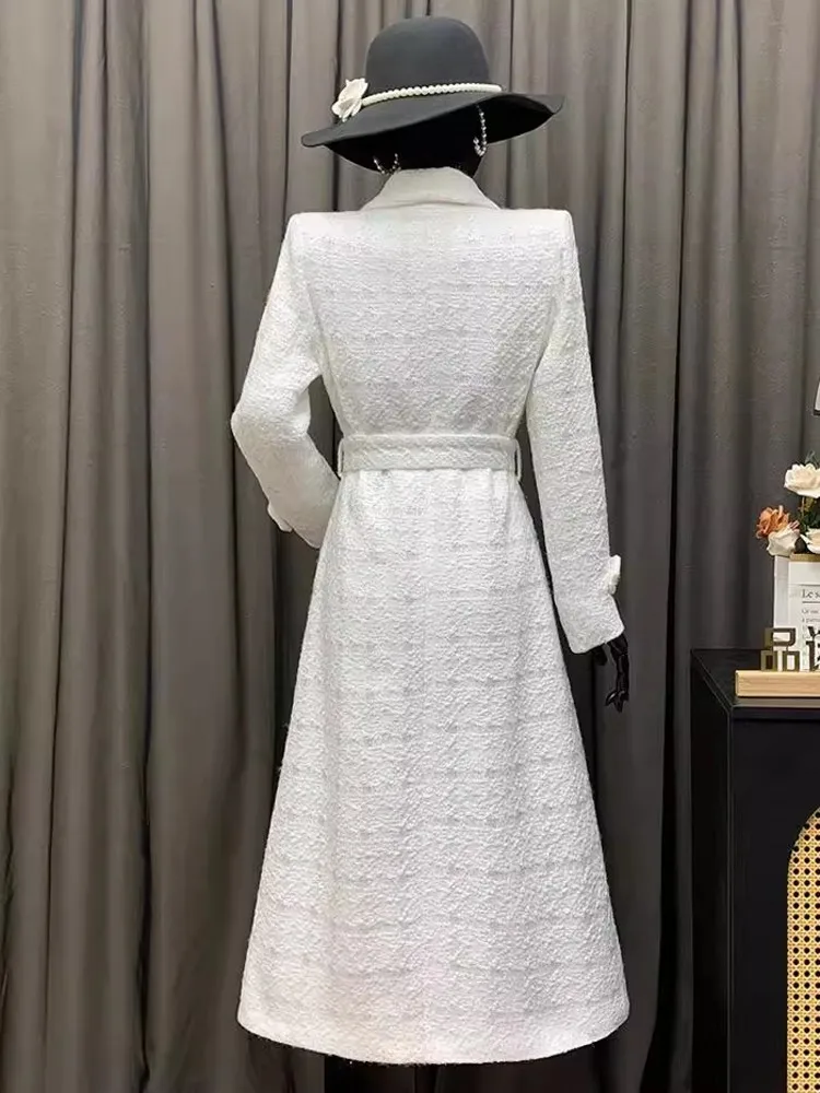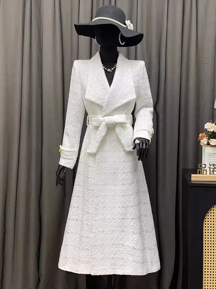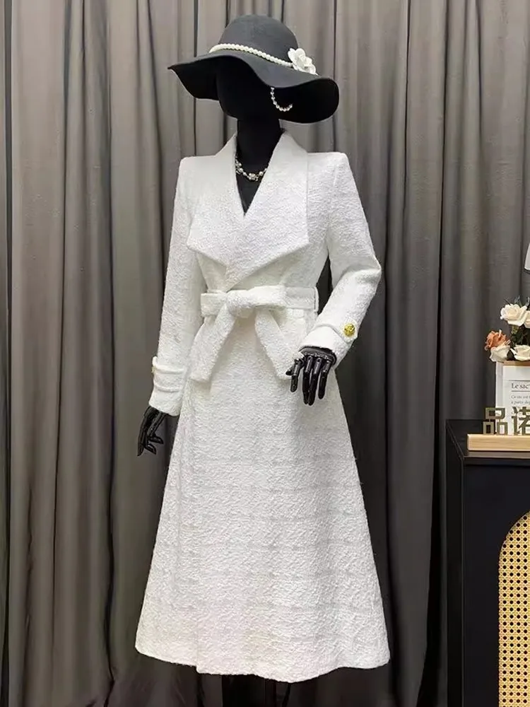 Elegant Women Belted Slim Fit Long Tweed Trench Coat Fashion British Style Ladies Windbreaker Winter Thick Warm Outwear Overcoat