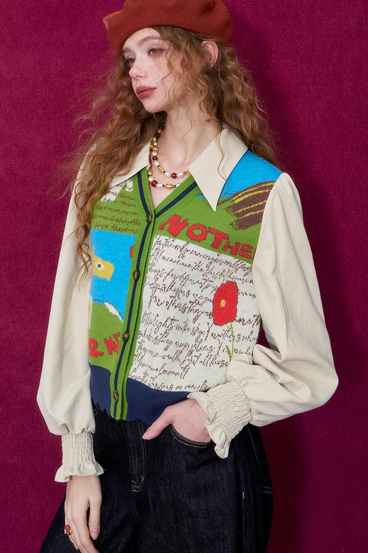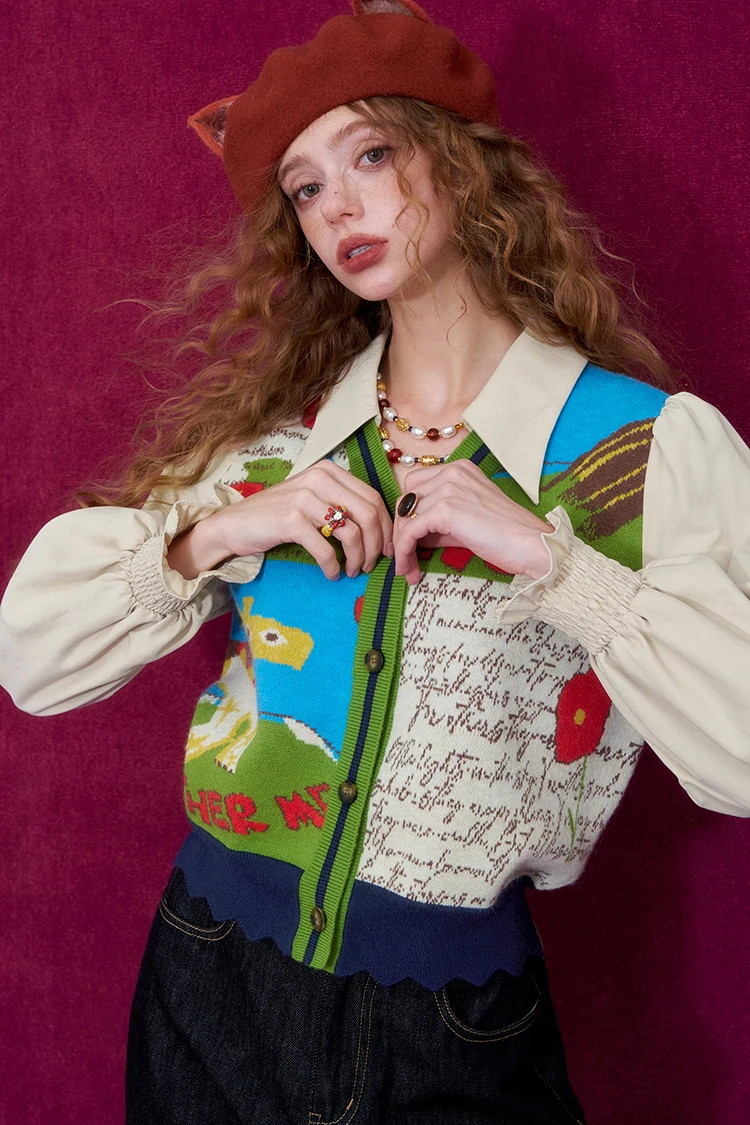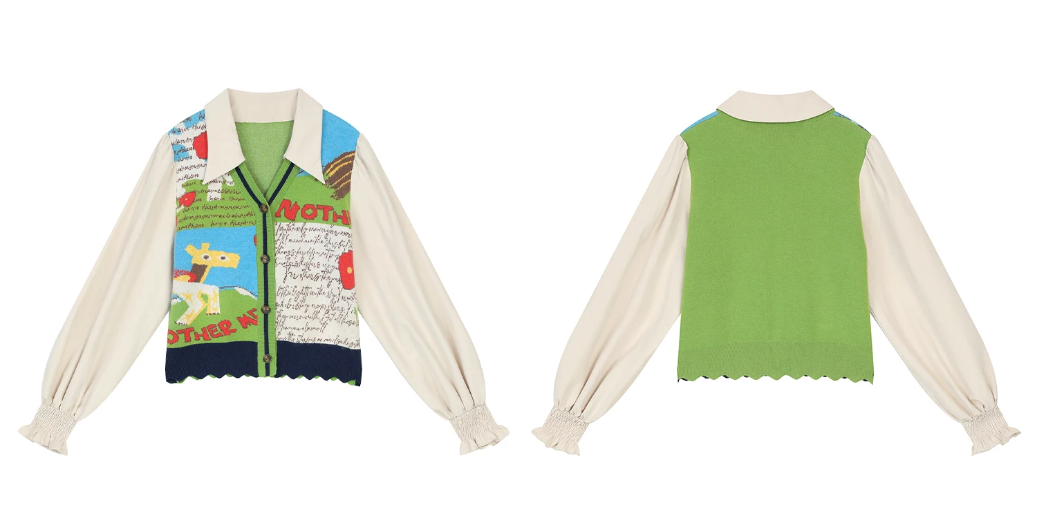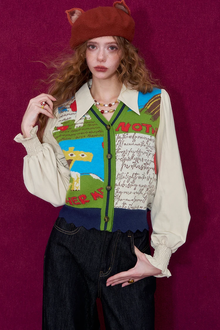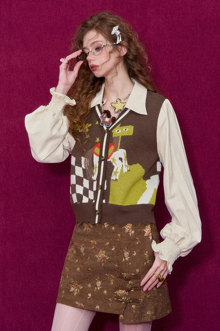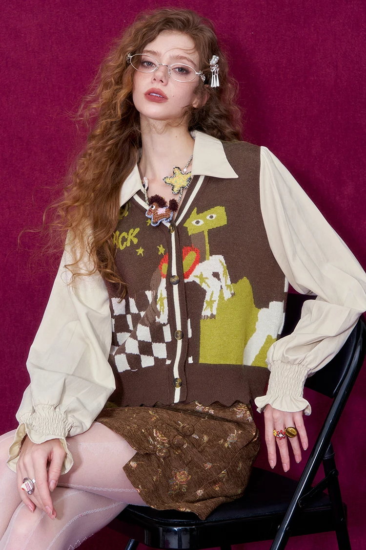 ELFSACK Women Knit Cardigan 2026 Winter Lapel Shirt V-Neck Vest Puff Sleeve Cartoon Print Casual Knit Top