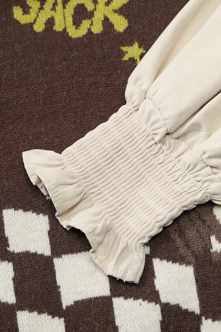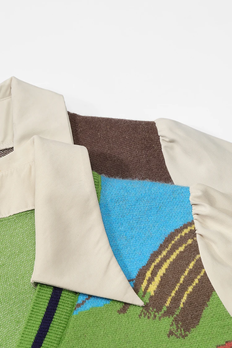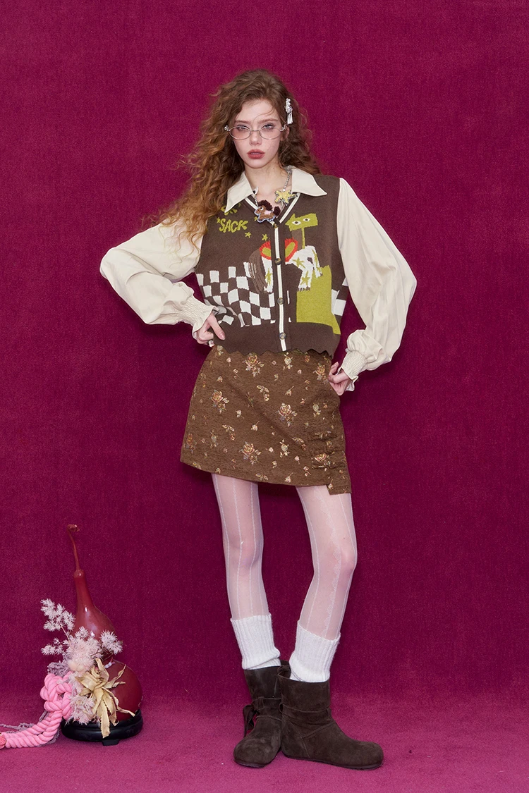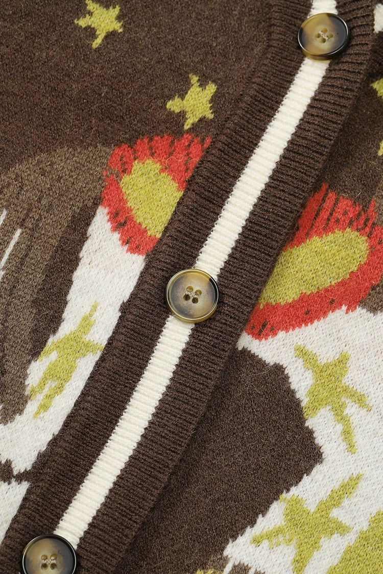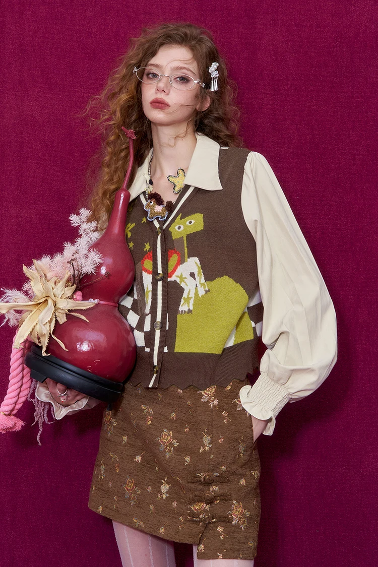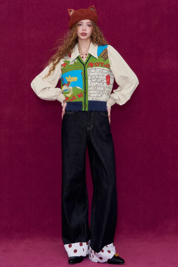 ELFSACK Women Knit Cardigan 2026 Winter Lapel Shirt V-Neck Vest Puff Sleeve Cartoon Print Casual Knit Top
