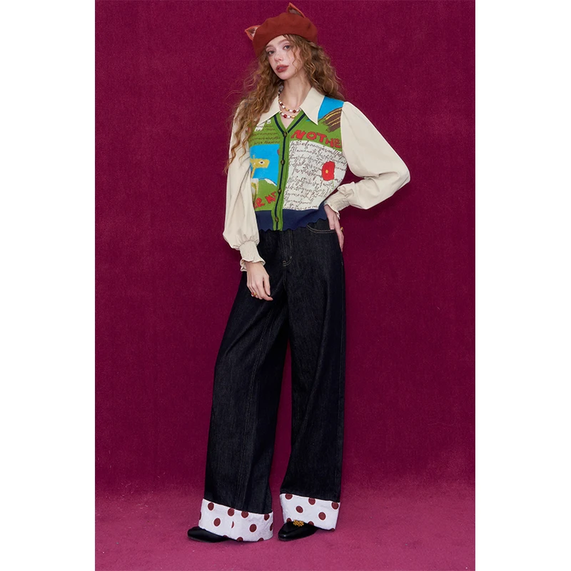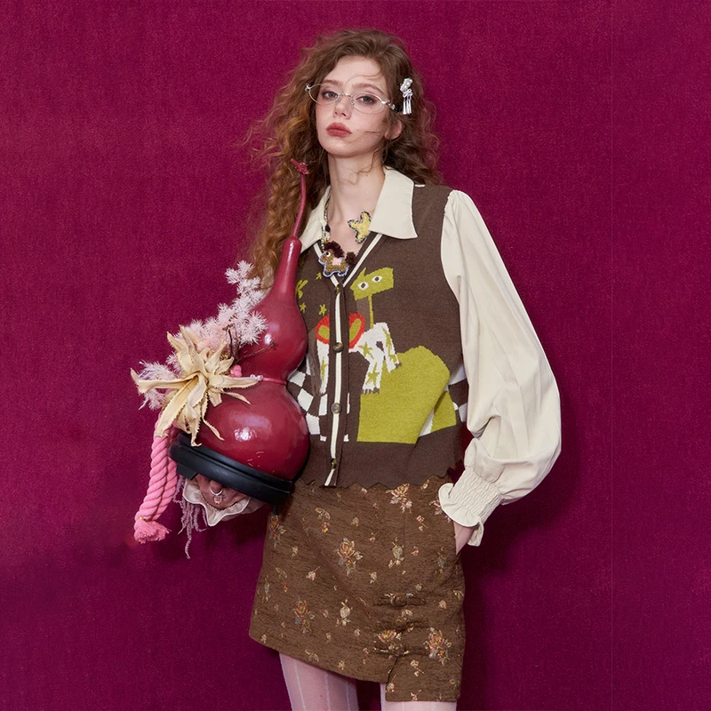 ELFSACK Women Knit Cardigan 2026 Winter Lapel Shirt V-Neck Vest Puff Sleeve Cartoon Print Casual Knit Top