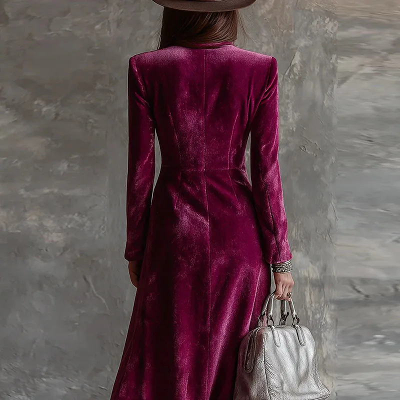 Fall Winter Double Breasted Velvet Cardigan Dress Woman Elegant Lapel Hollow Split Long Dress Vintage Long Sleeve Office Dresses