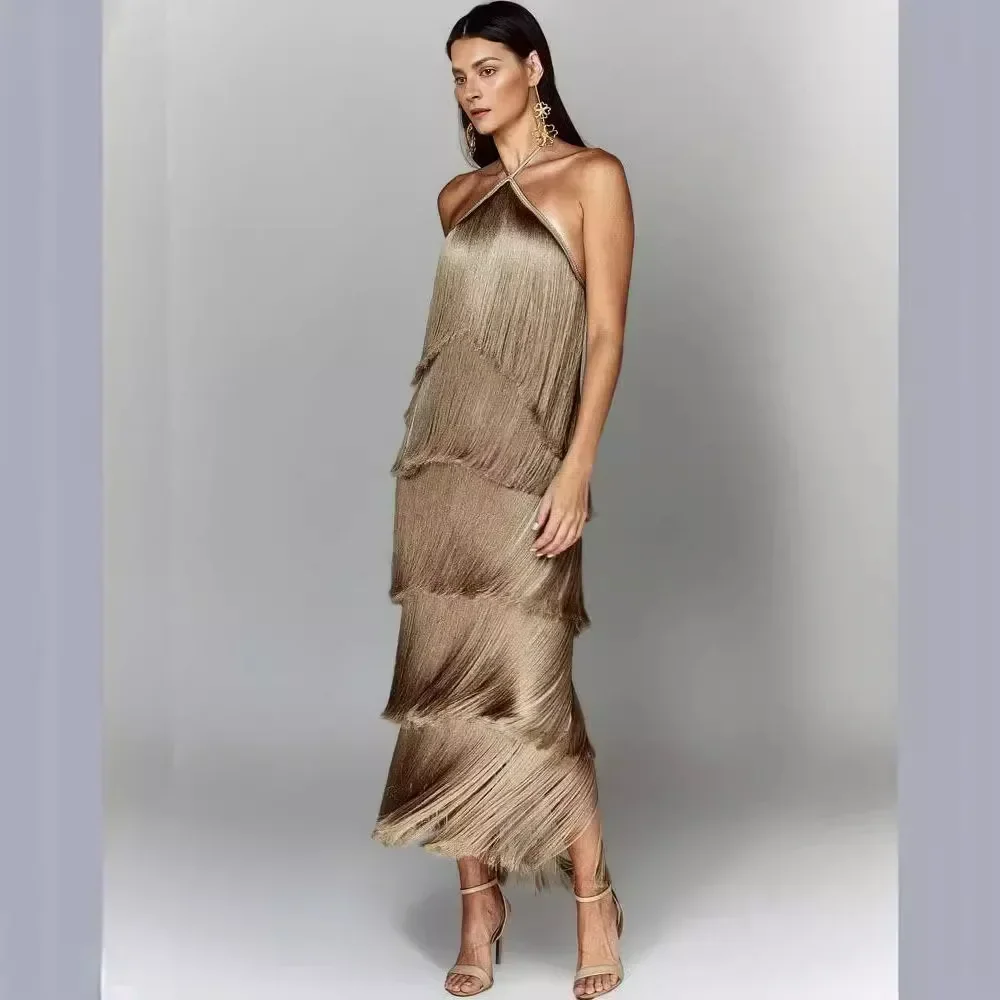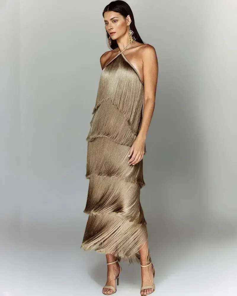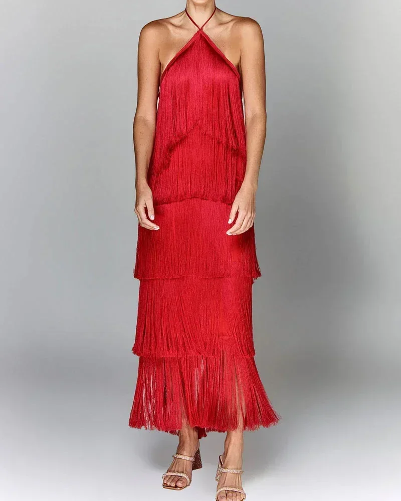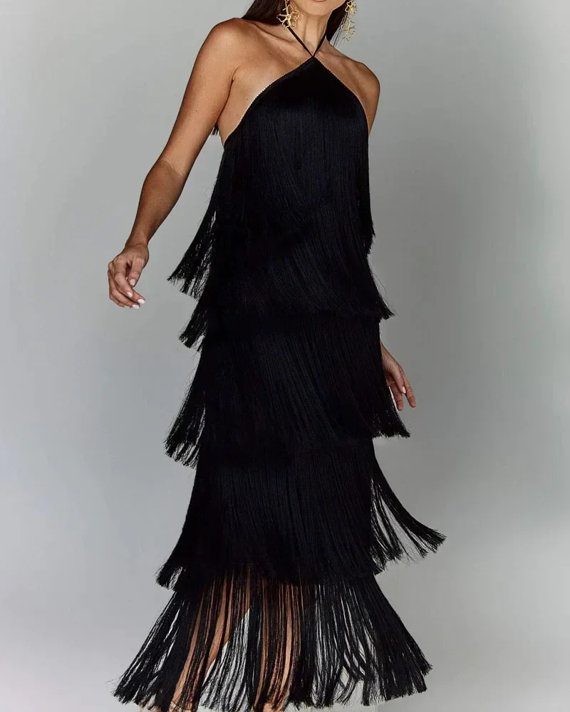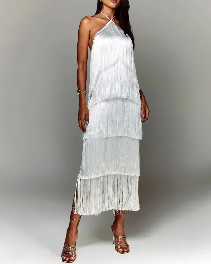 Fashion Neck Fringed Backless Slit Dress for Women