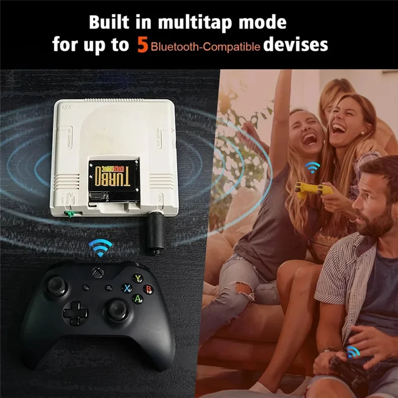 Support for simulating the 2 buttons, 3 buttons, and 6 buttons PCE controllers Built in multitap mode for up to 5 Bluetooth-Compatible devises.