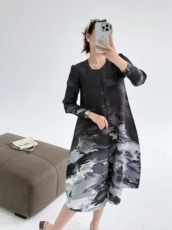 Fold Miyake Pleated Single Breasted Women’s Dresses 2025 Summer New French Tie-Dye Printed V-Neck Dresses Loose Midi Dresses