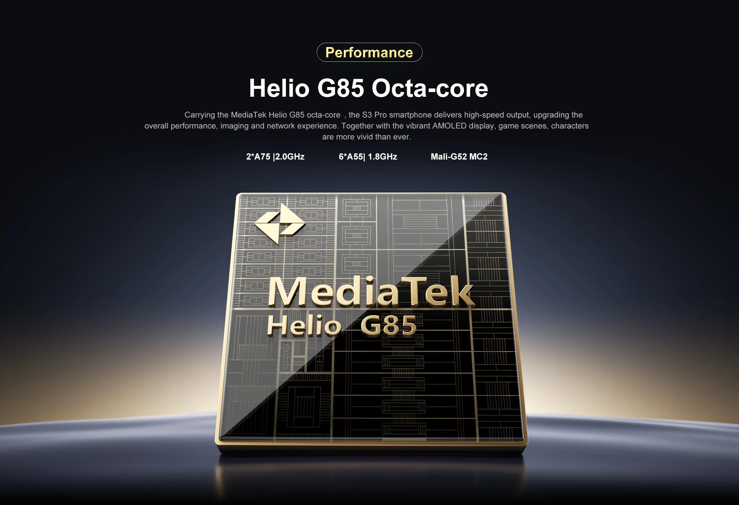 Carrying the MediaTek Helio G85 octa-core, the S3 PRO smartphone delivers high-speed output, upgrading the overallperformance, image and network experience. Together with the vibrant AMOLED display, game scenes, characters are more vivid than ever.