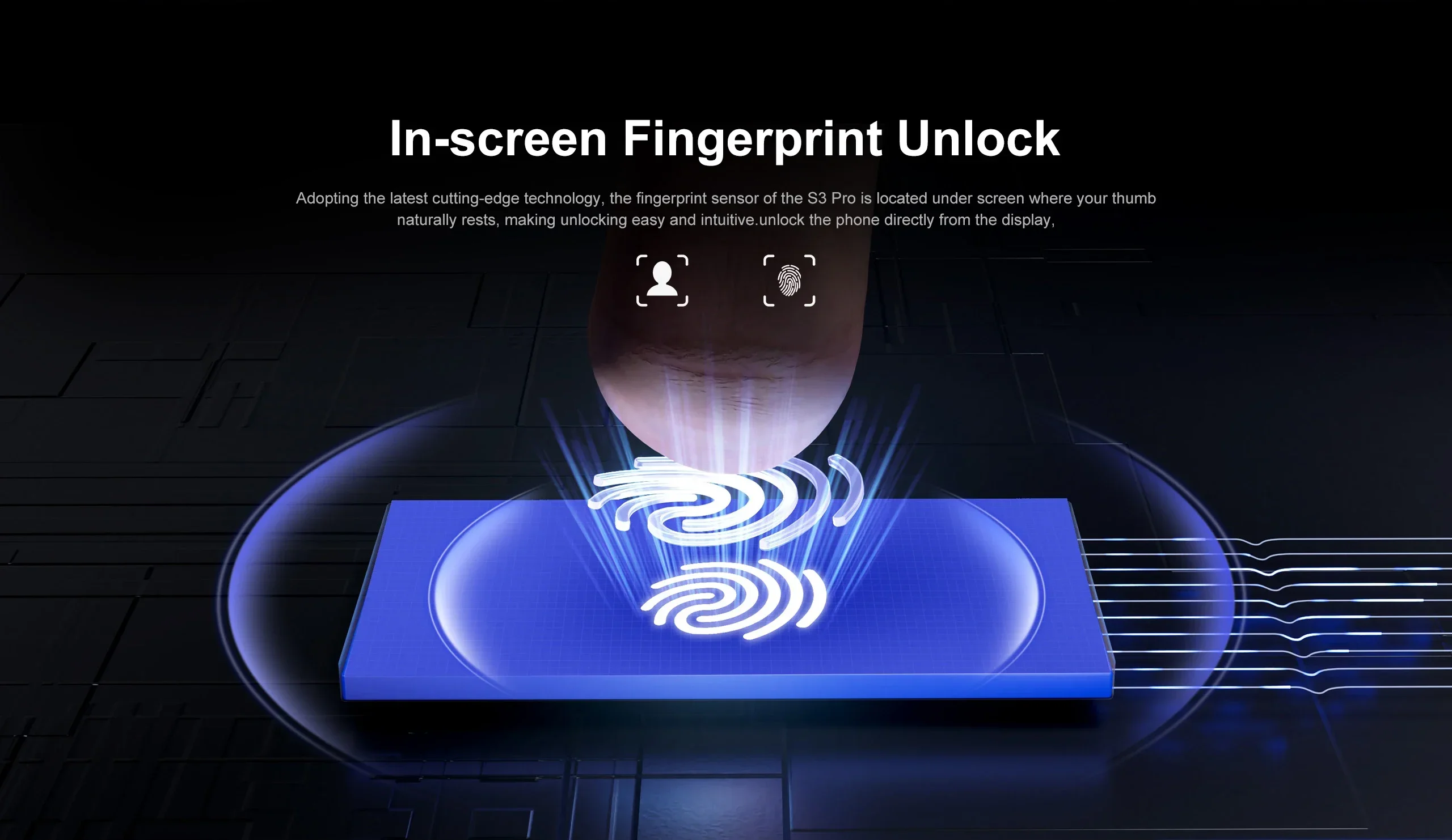 Adopting the latest cuting-edge technology, the fingerprint sensor of the S3 PRO is located under screen where your thumb