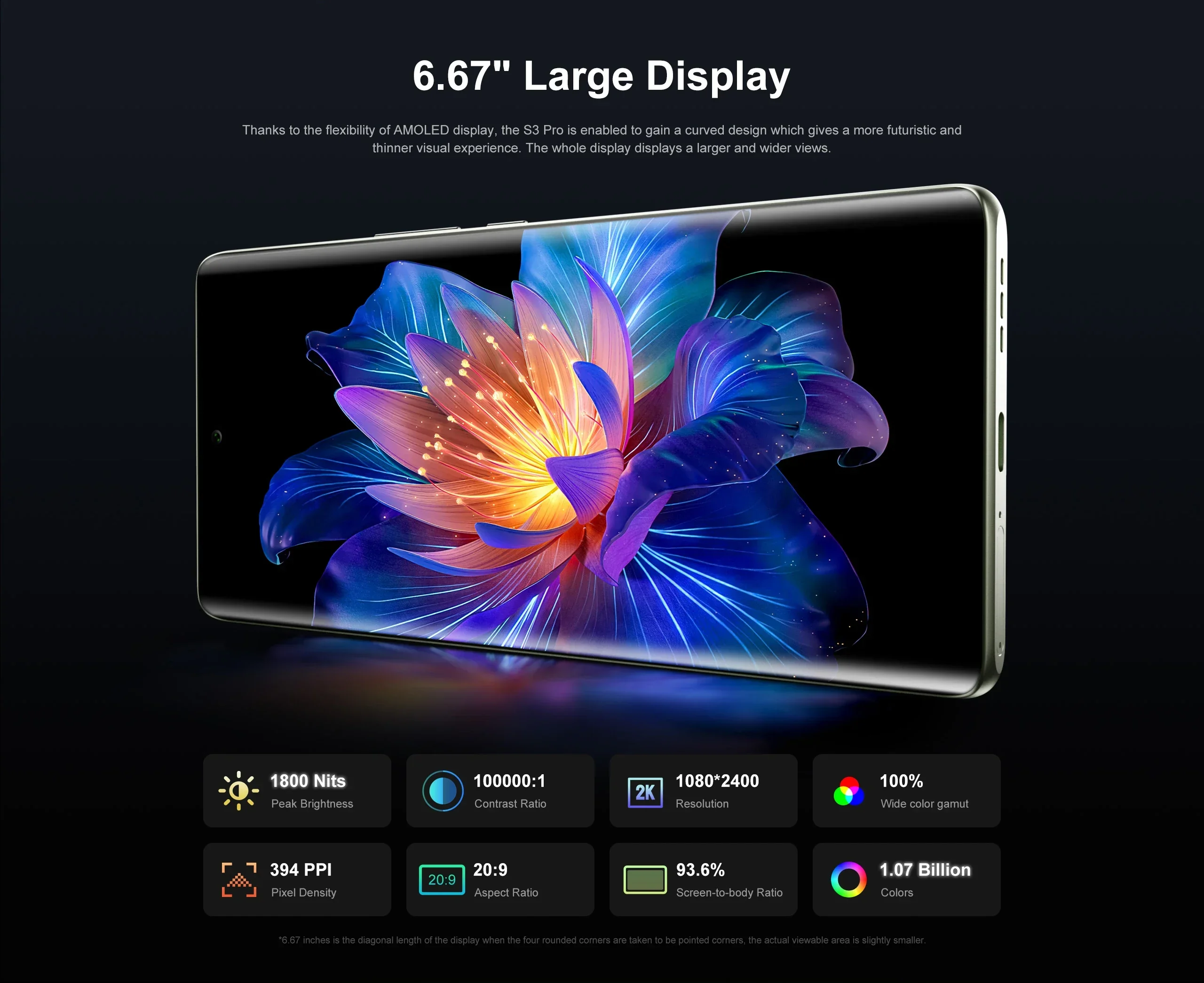 Thanks to the flexibility of AlMOLED display, the S3 PRO is enabled to gain a curved design which gives a more futuristic andthinner visual experience. The whole display displays a larger and wider views.
