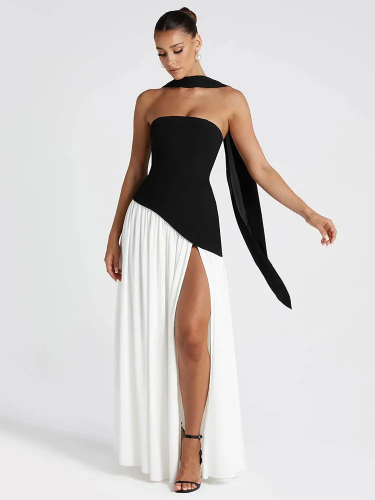 GACVGA Elegant Strapless Sexy Maxi Dress Women Gown Scarf Collar Bandage Backless High Split Club Party Evening Long Dress