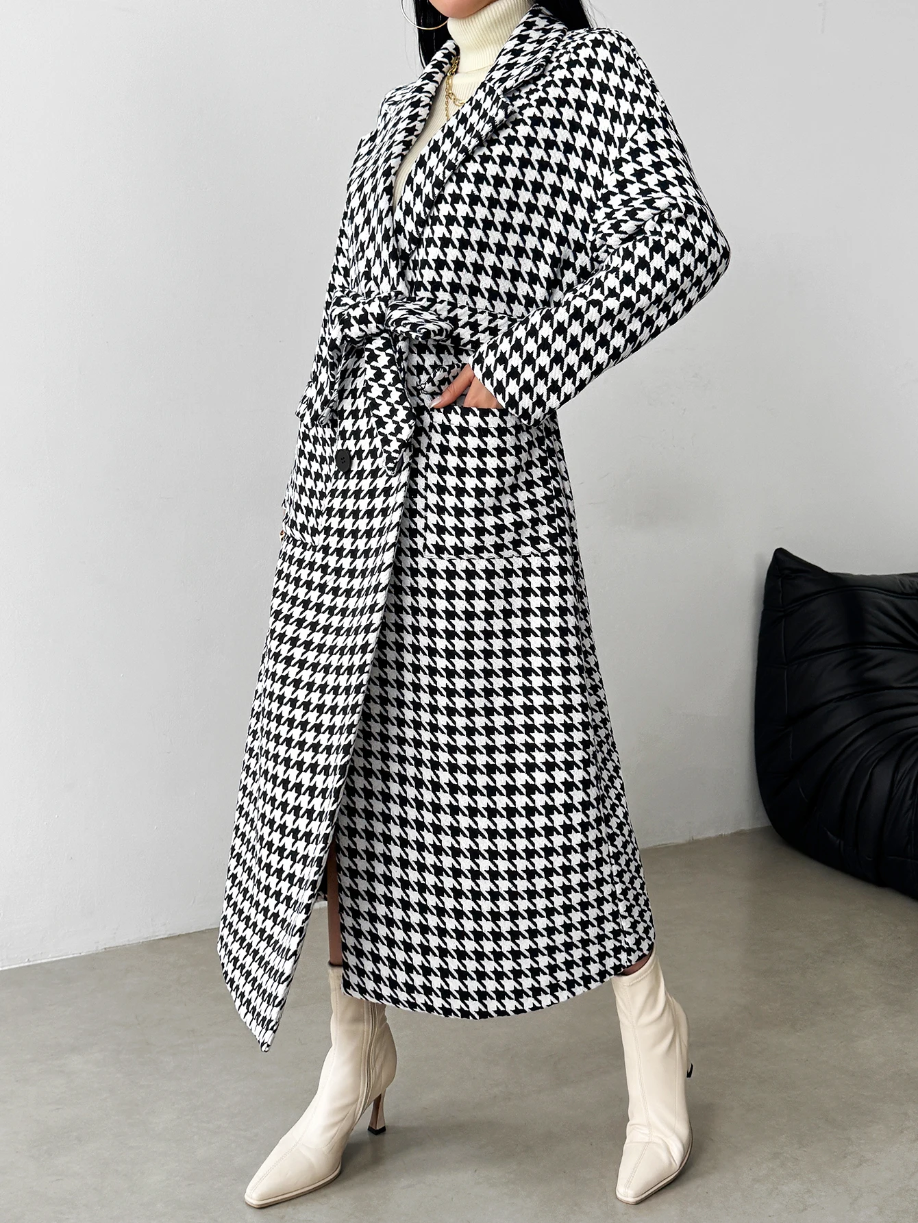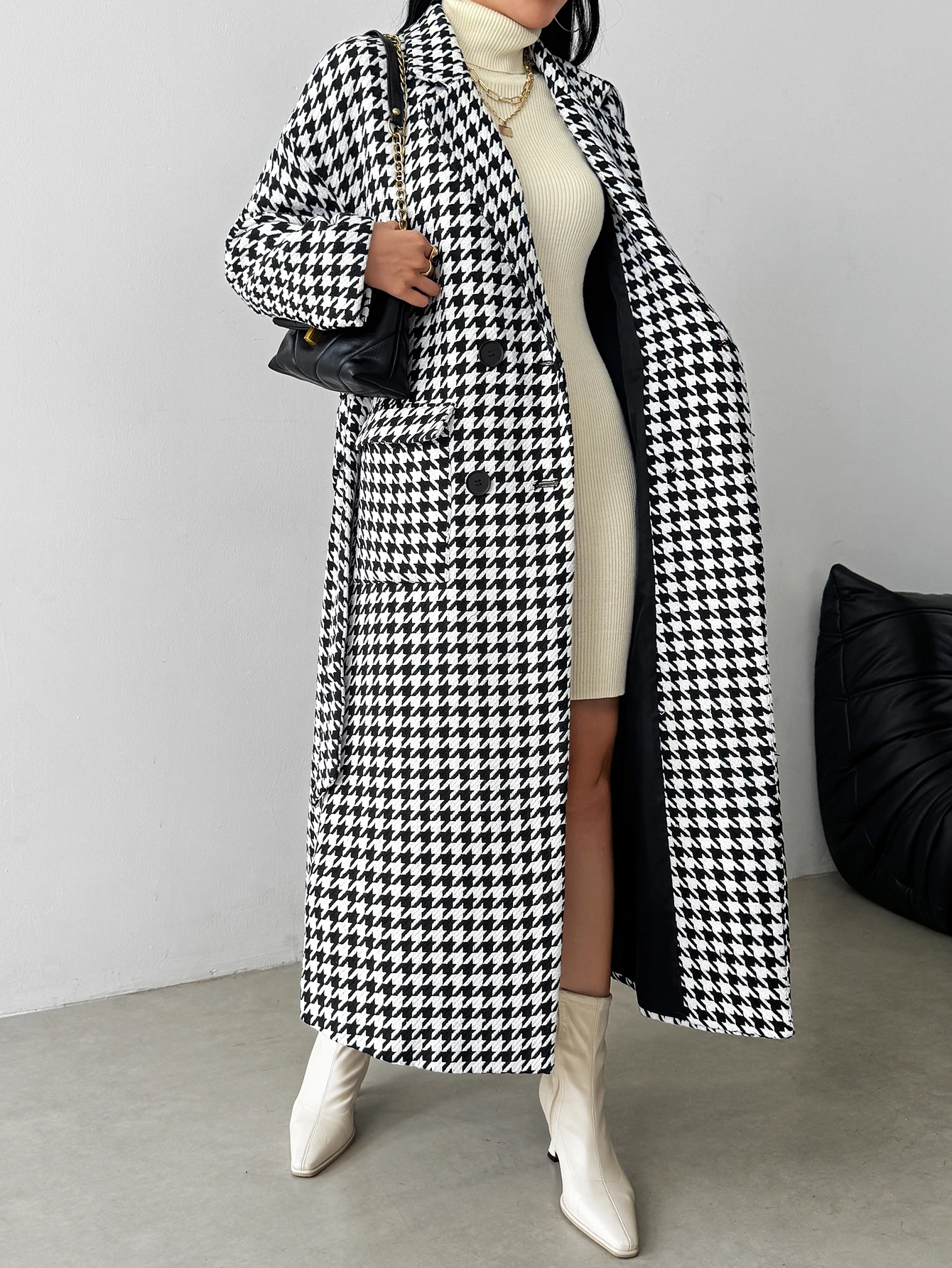 Gingham Plaid Woolen Coat with Pockets And Buttons for Office And Airport Casual Autumn Winter Wear