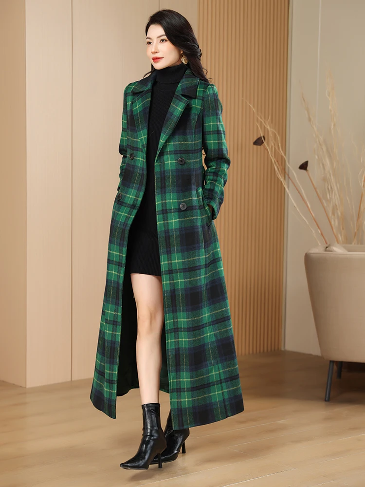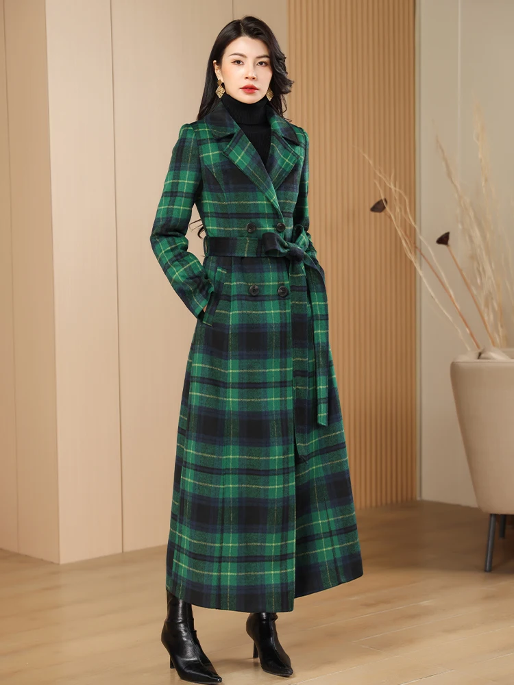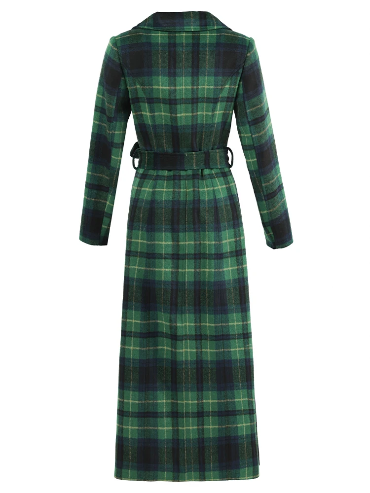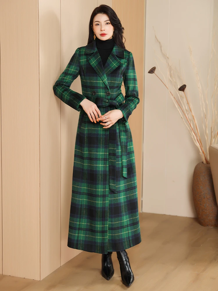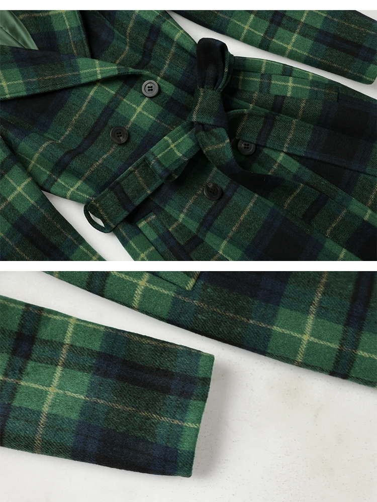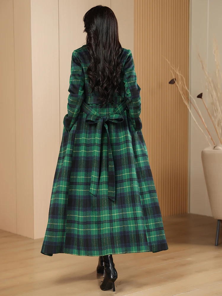 Green Plaid Slimming Woolen Coat Elegant Suit Collar Jacket High-End Autumn Winter Trendy Outerwear 2025