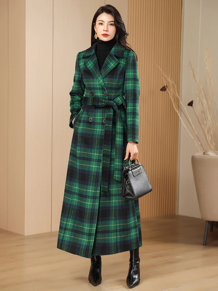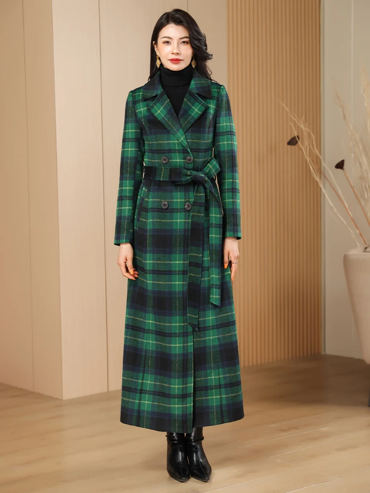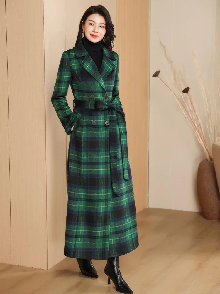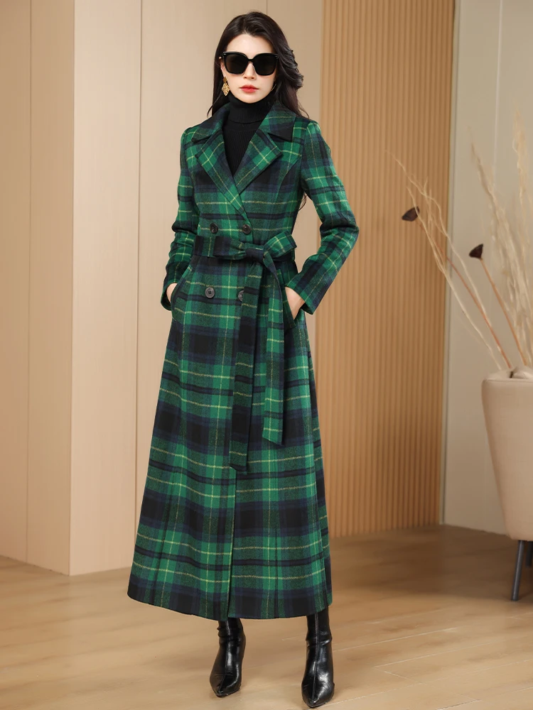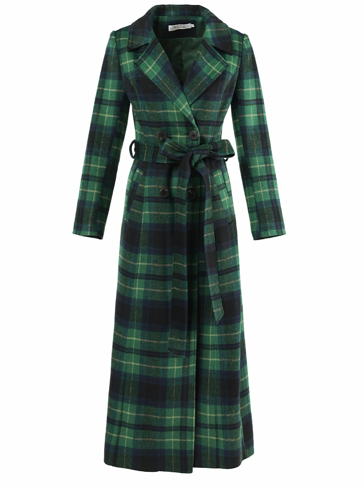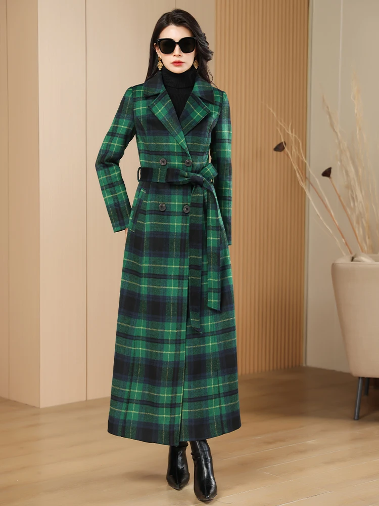 Green Plaid Slimming Woolen Coat Elegant Suit Collar Jacket High-End Autumn Winter Trendy Outerwear 2025