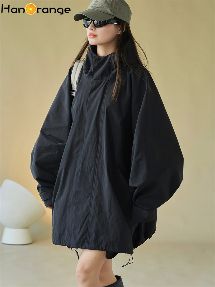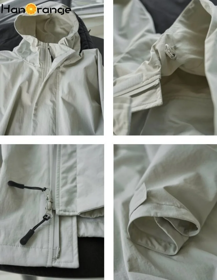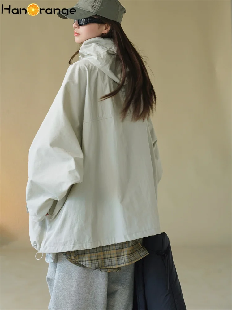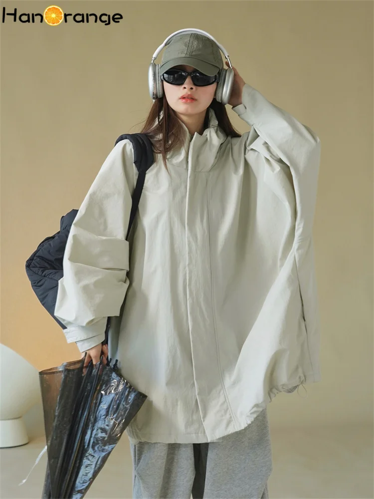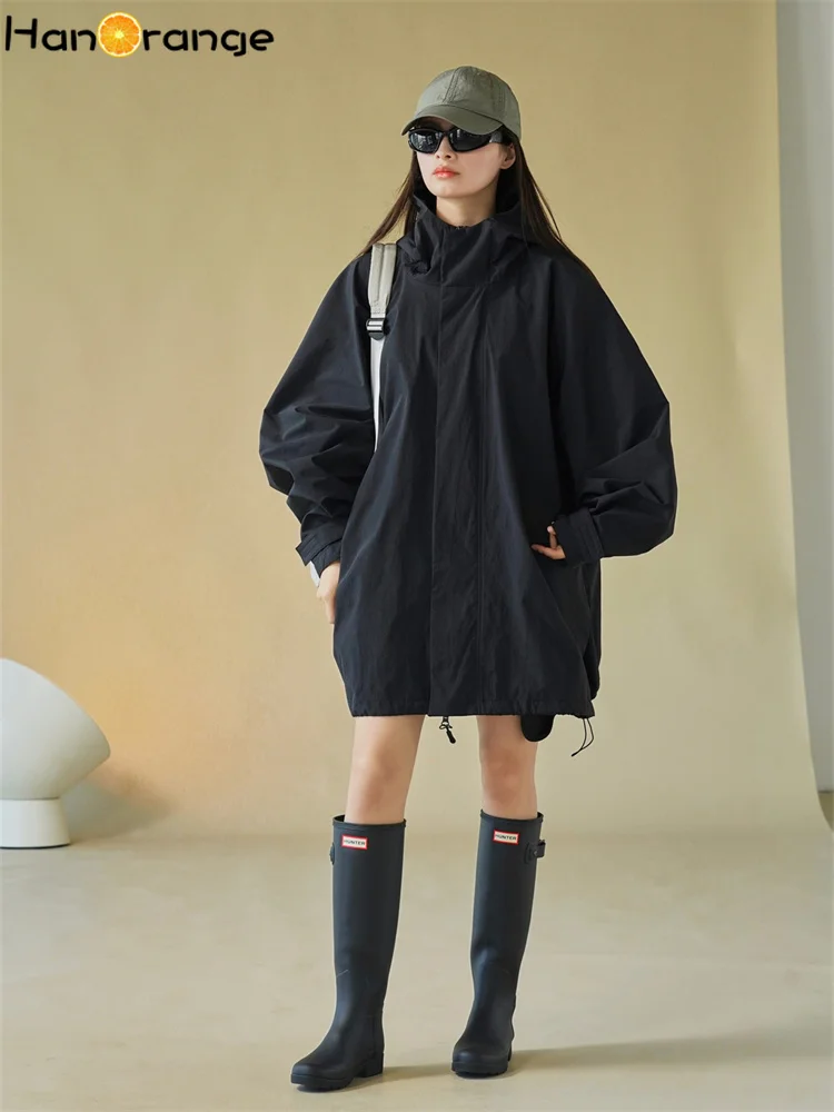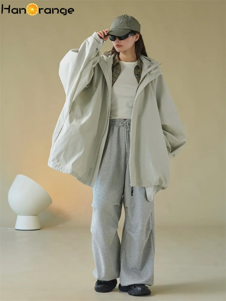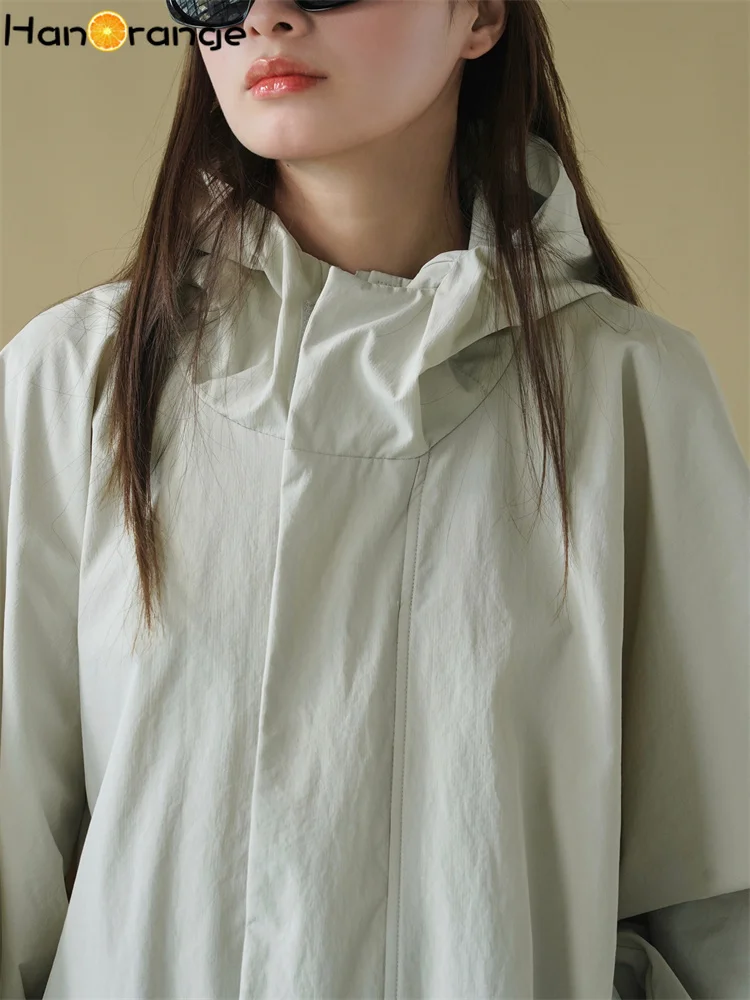 HanOrange 2025 Early Spring Silhouette Hooded Jacket Windbreaker Women Loose Windproof 100% Nylon Trench Light Gray/Black