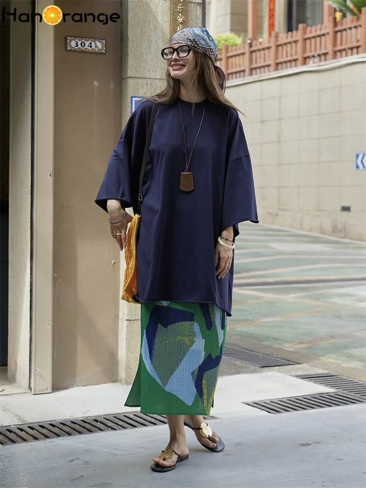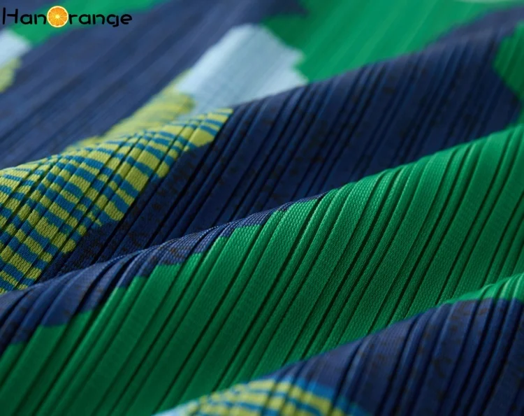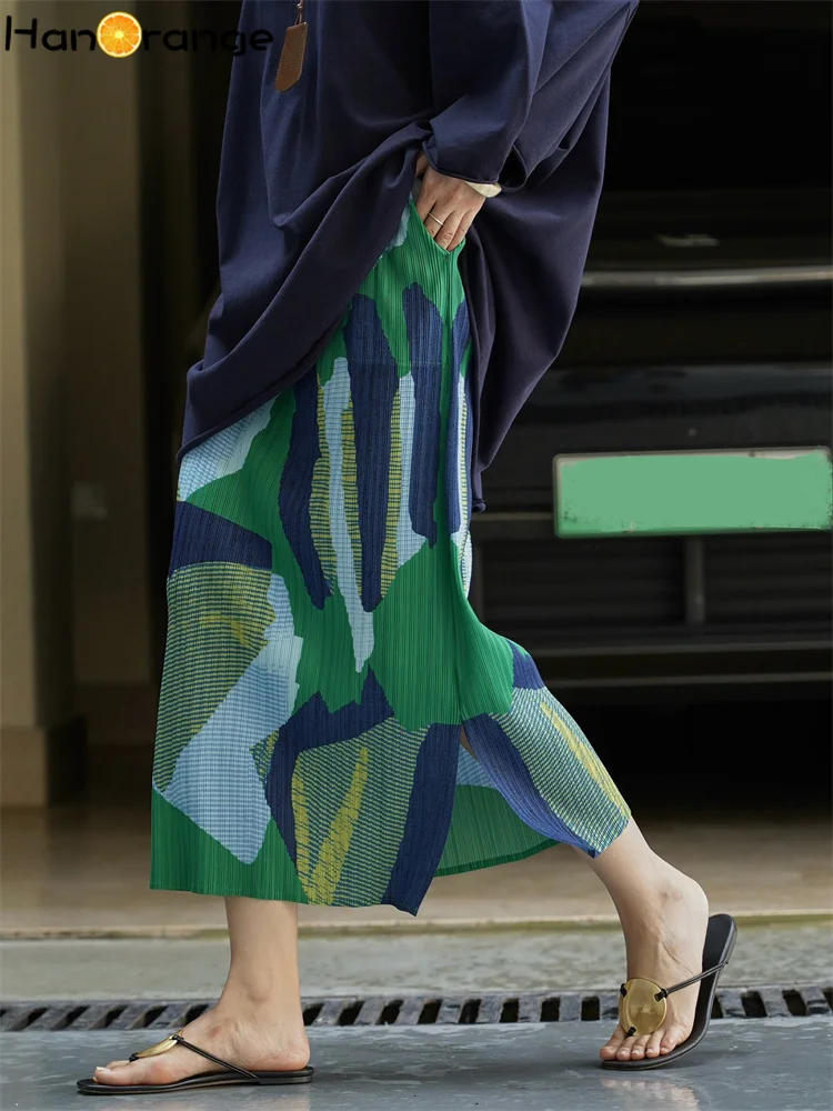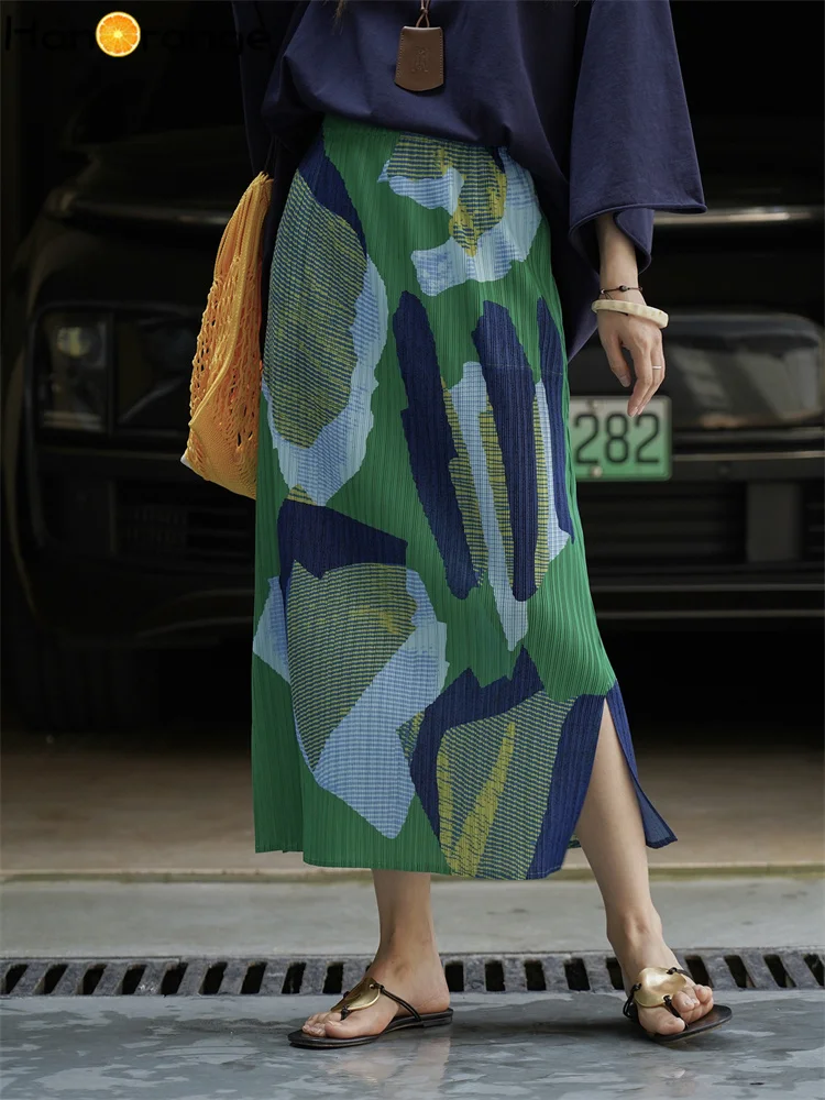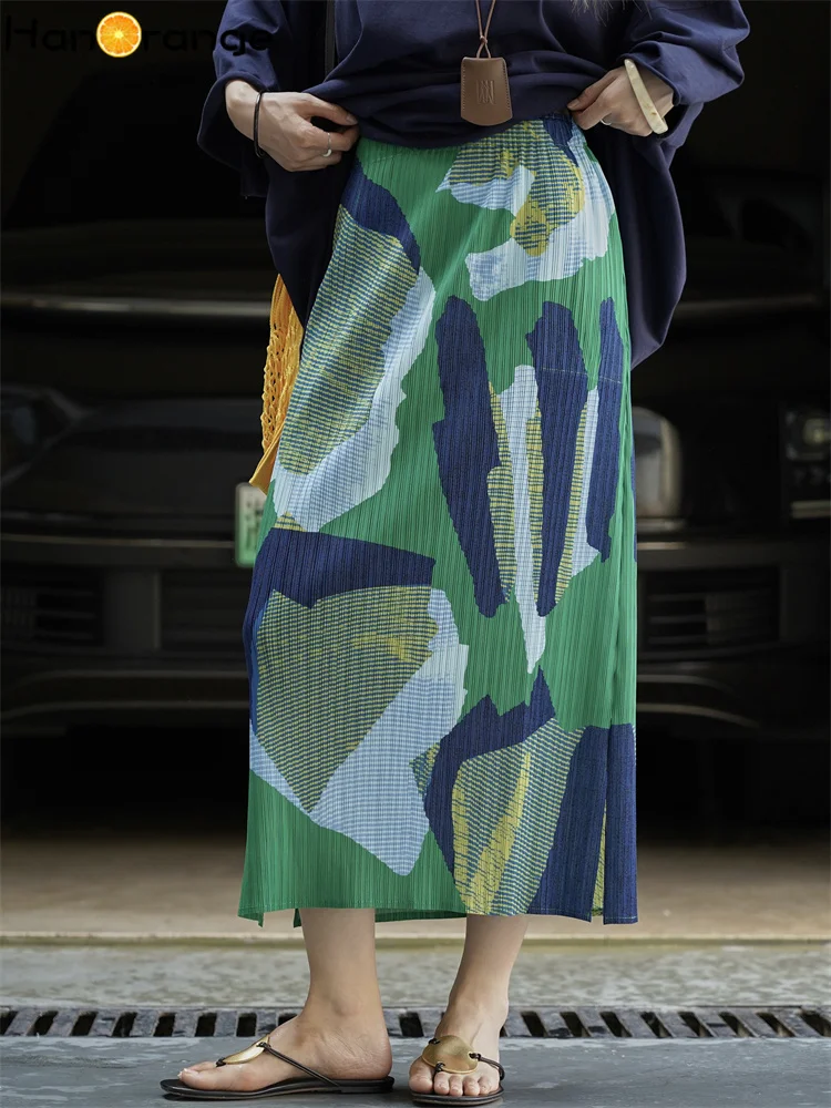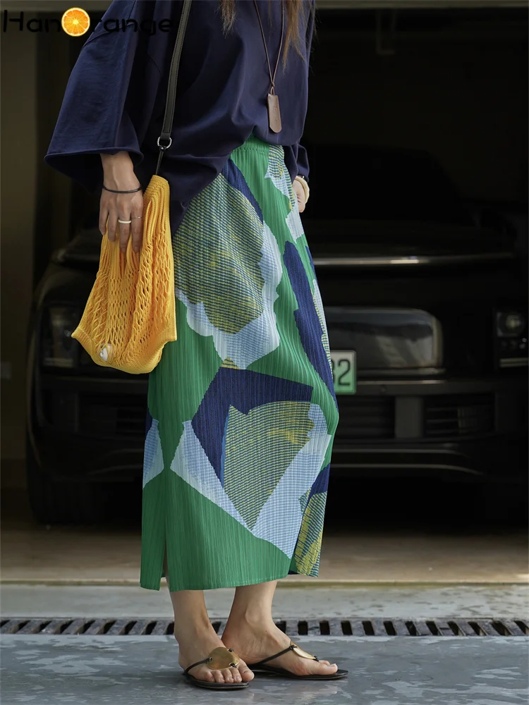 HanOrange 2025 Summer Contrasting Printed Pleated Skirt Lightweight Elegant Long Skirt Green