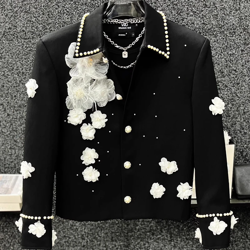 High-End Pearl Stylish Unique Jackets Men 2025 Autumn New Short Style Coats Handsome Personality Contrast Color Flower Chic Tops