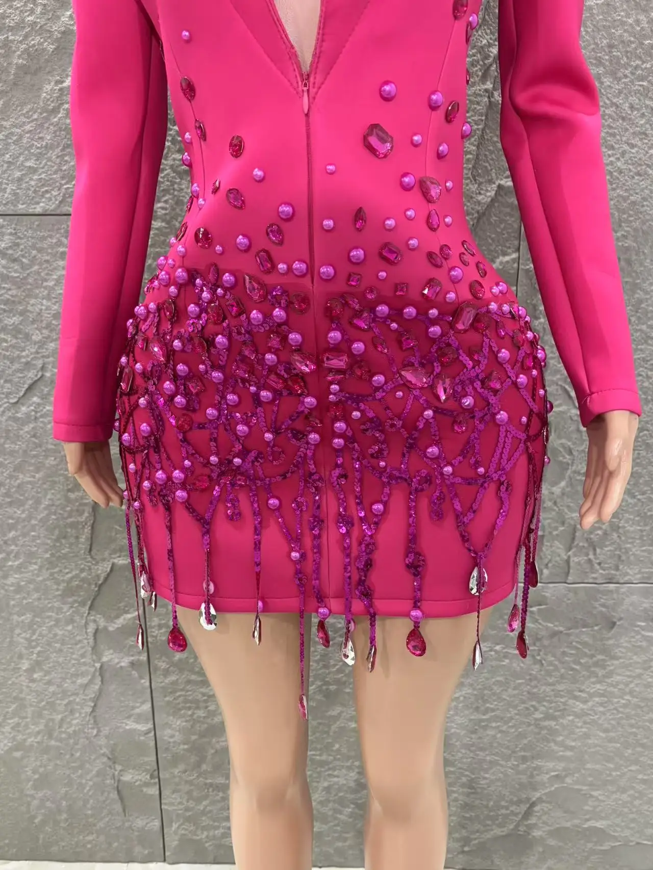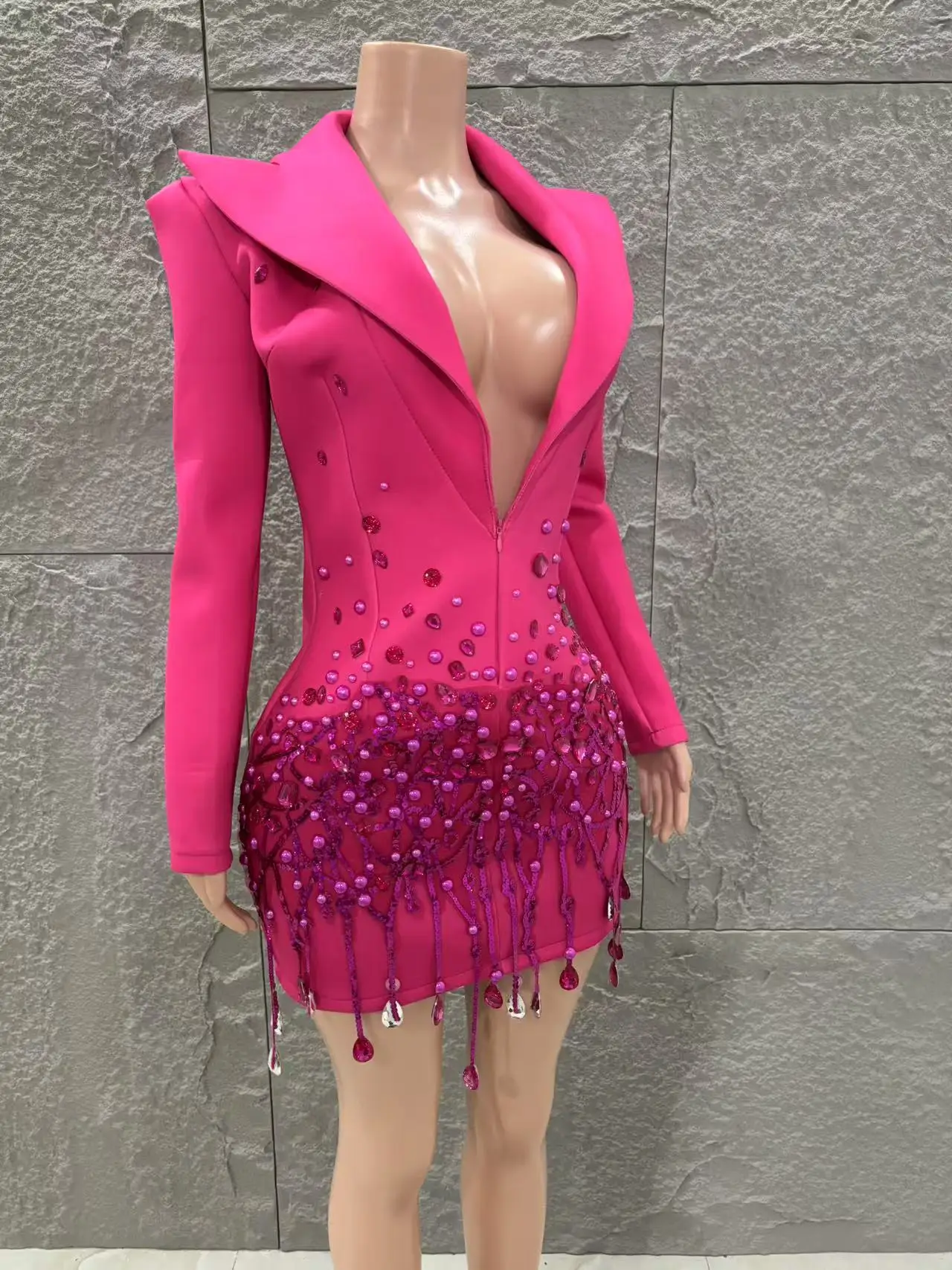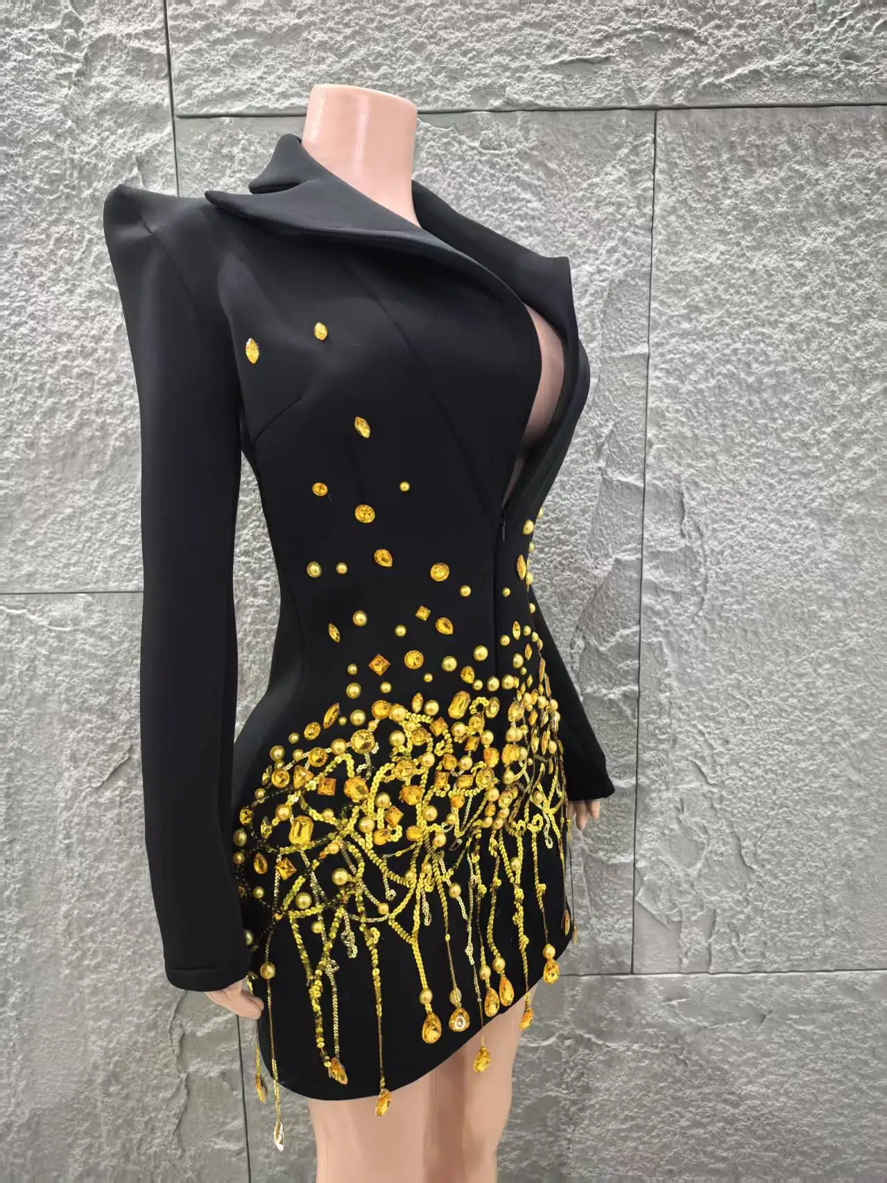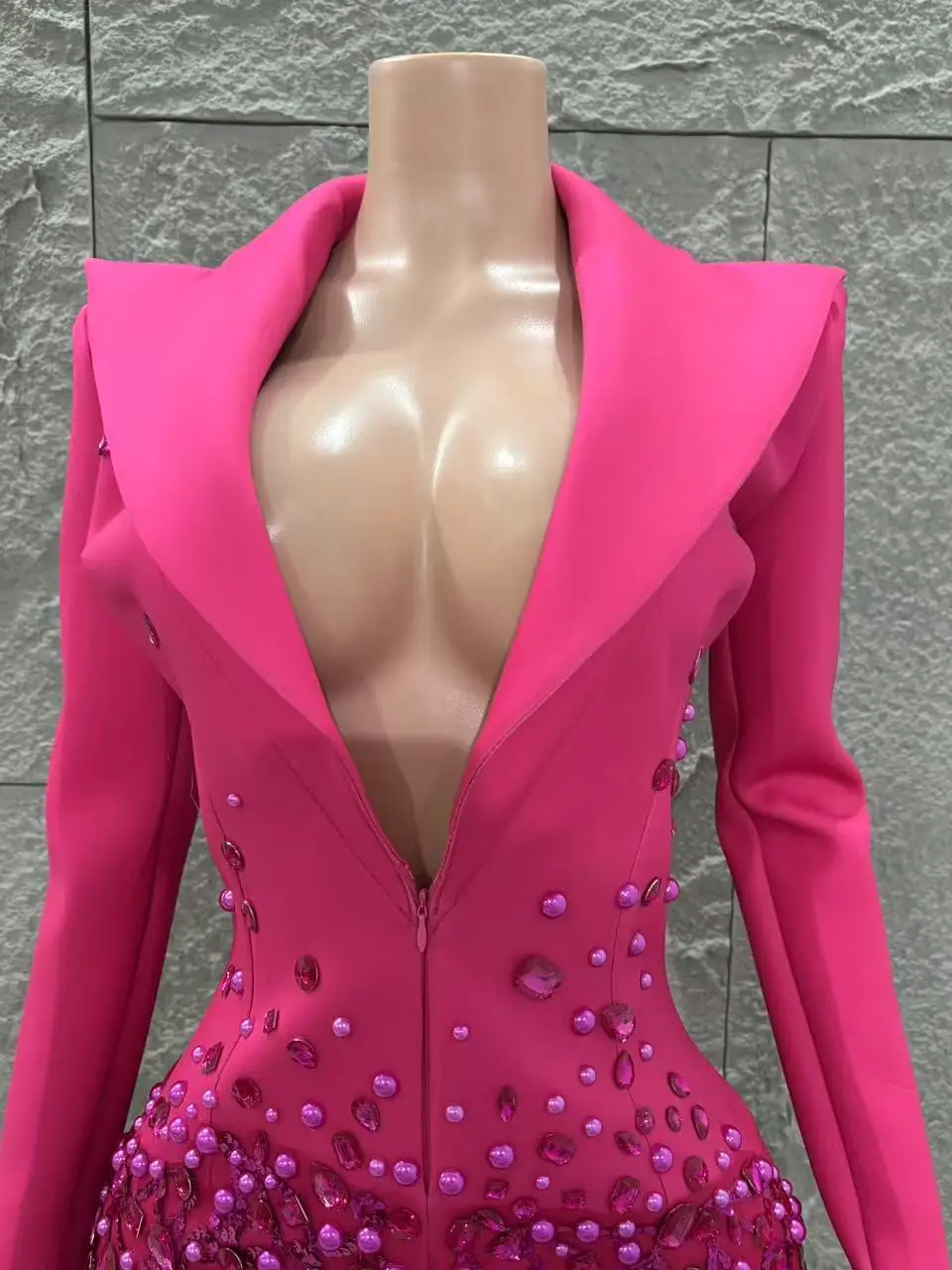 High Quality Women Long Sleeve Sexy Deep V-Neck Bodycon Blazer Dress Shinning Sequins Celebrate Nightclub Bar Singer Stage Wear