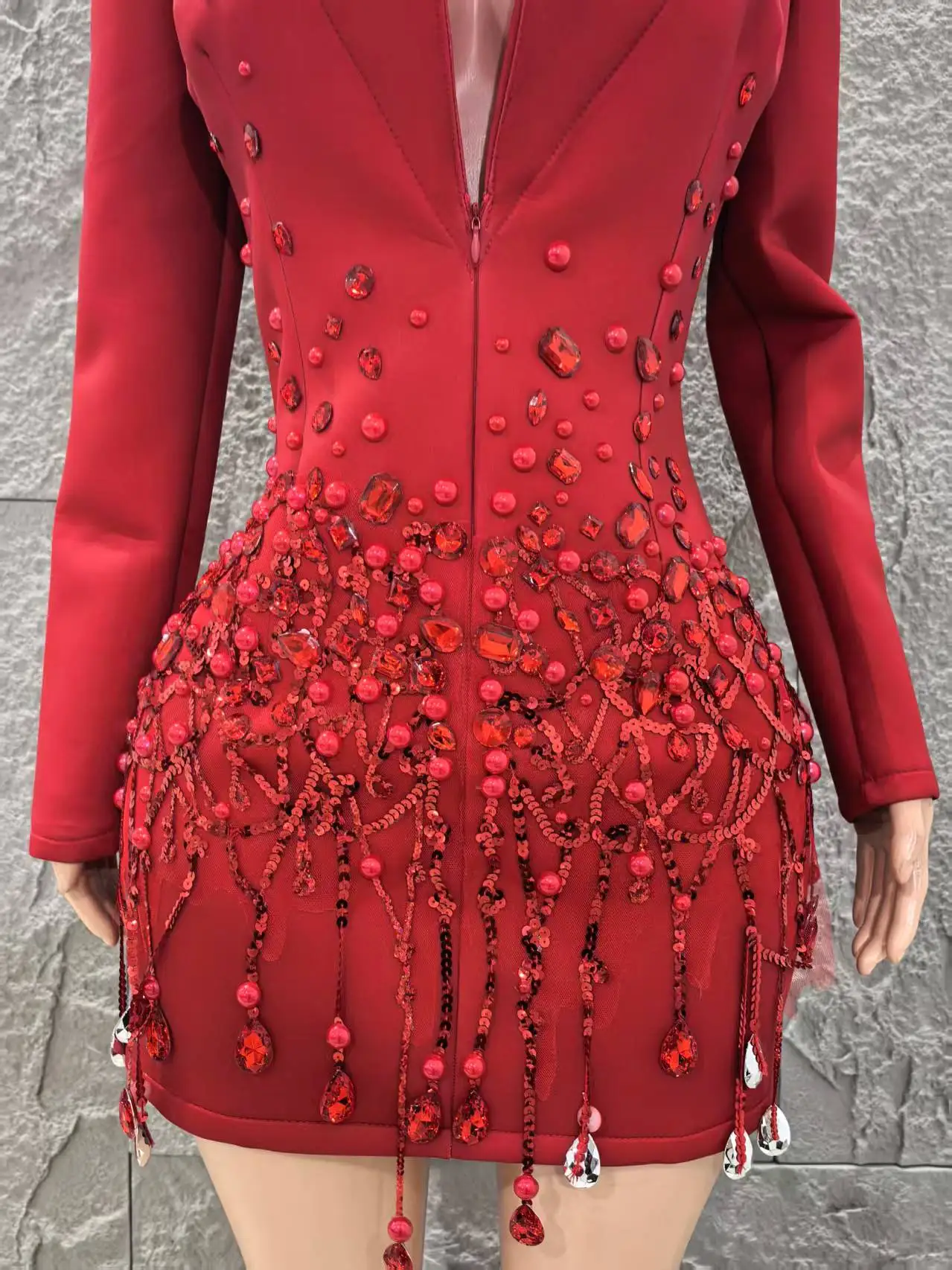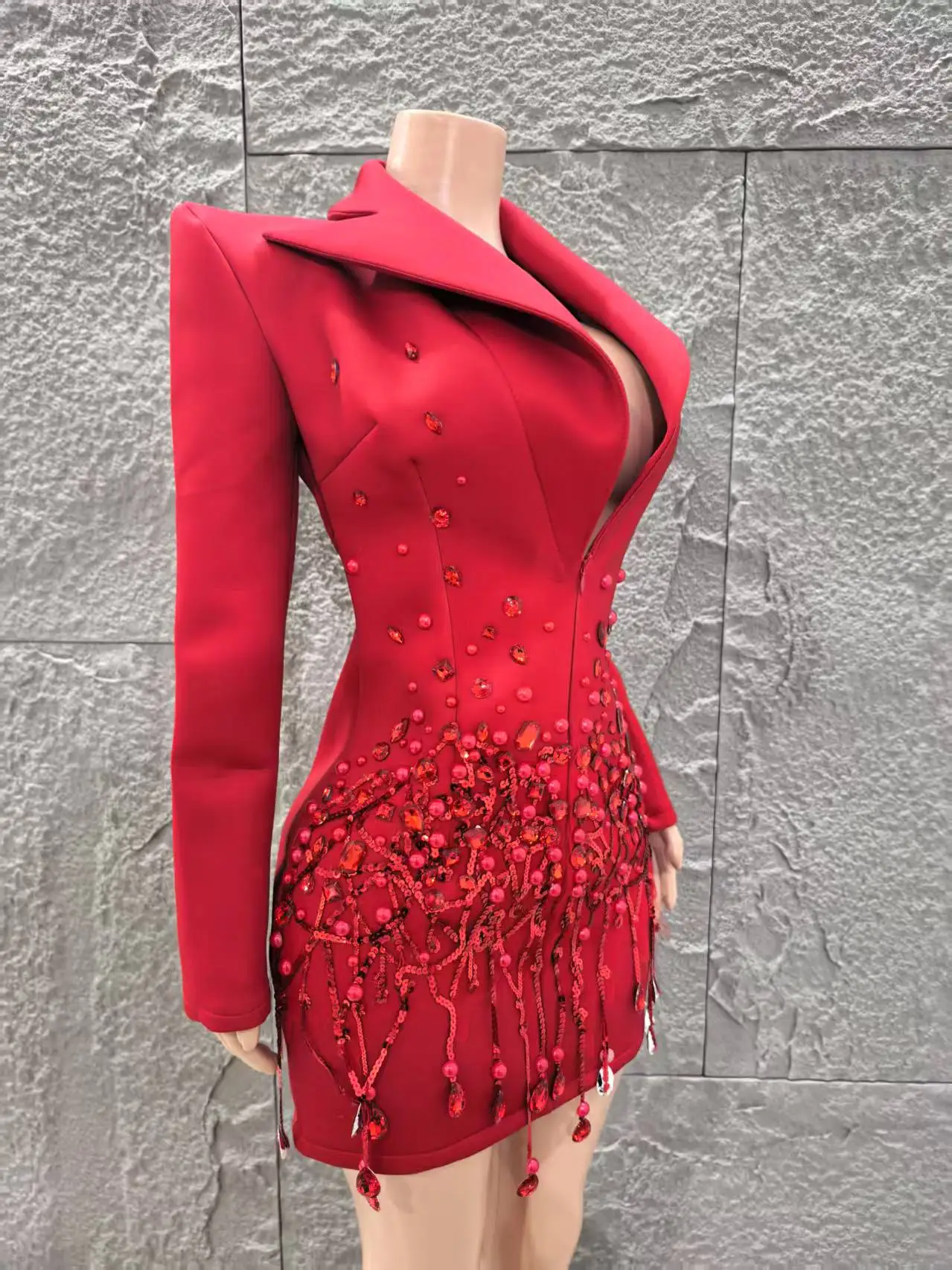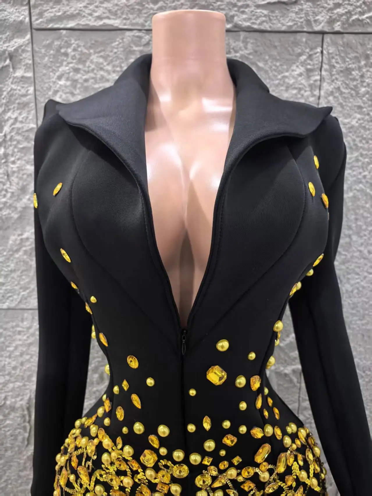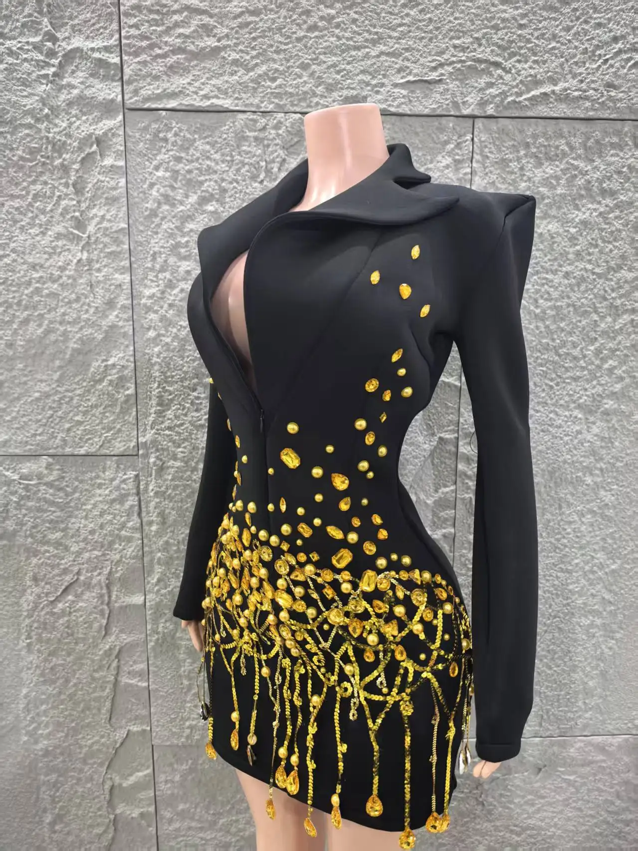 High Quality Women Long Sleeve Sexy Deep V-Neck Bodycon Blazer Dress Shinning Sequins Celebrate Nightclub Bar Singer Stage Wear