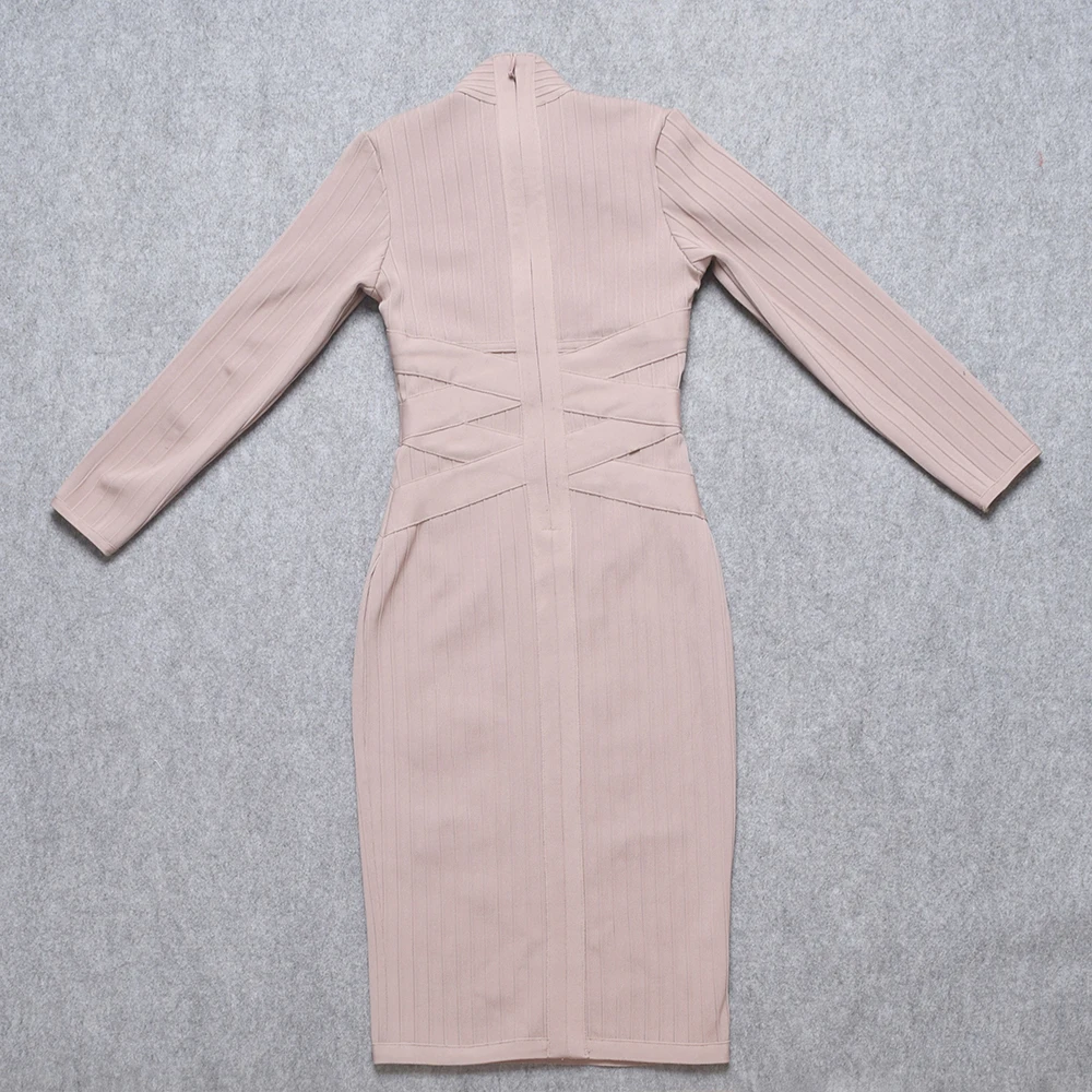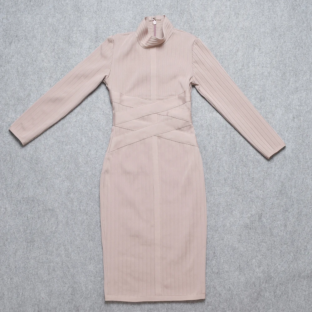 HQBORY High Quality Criss Cross Bandage Dress Long Sleeves Red 2023 For Women Office Lady Strip Bodycon Dress Nude XL Vestidos