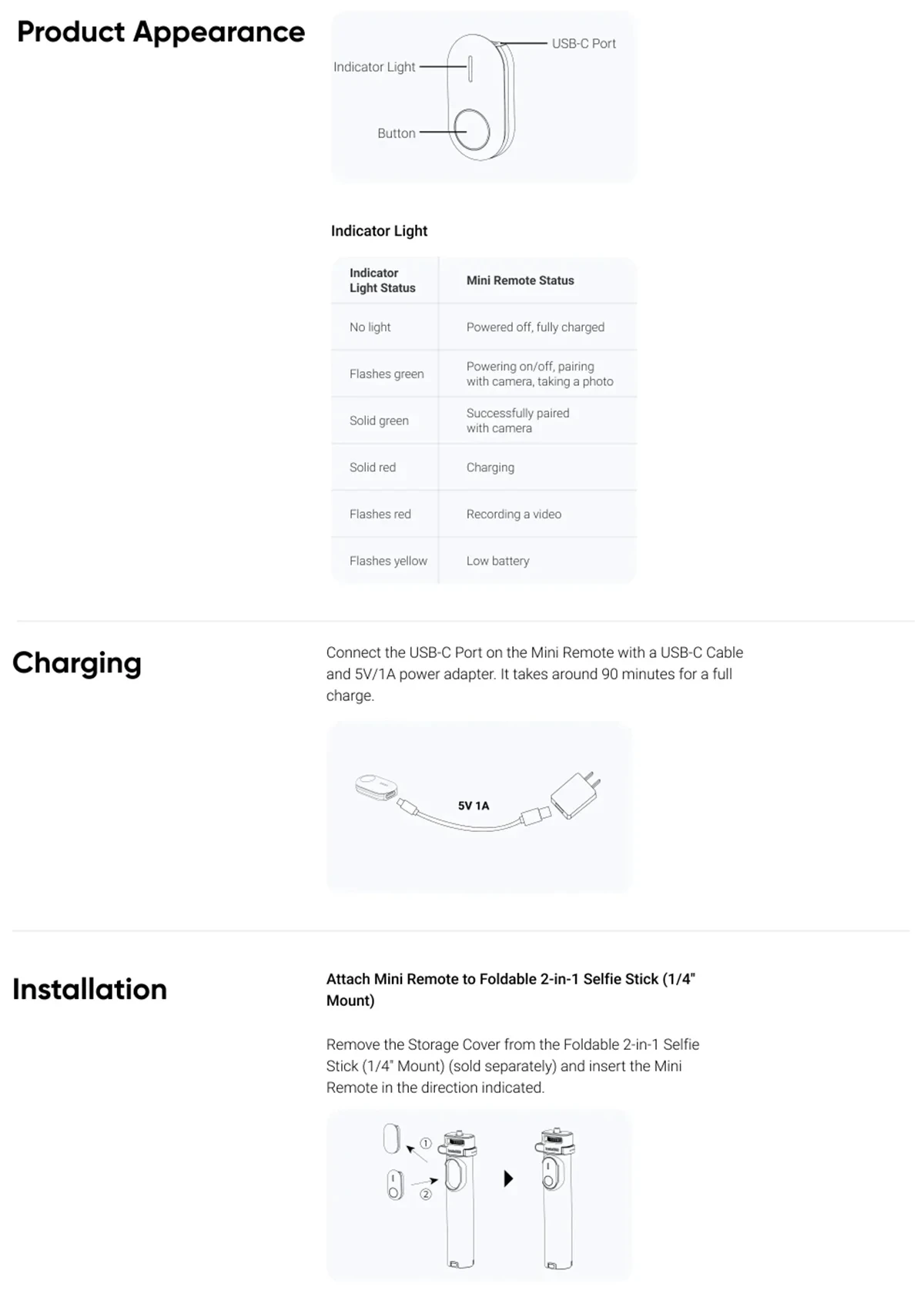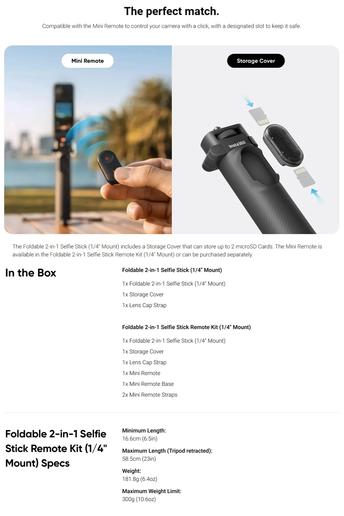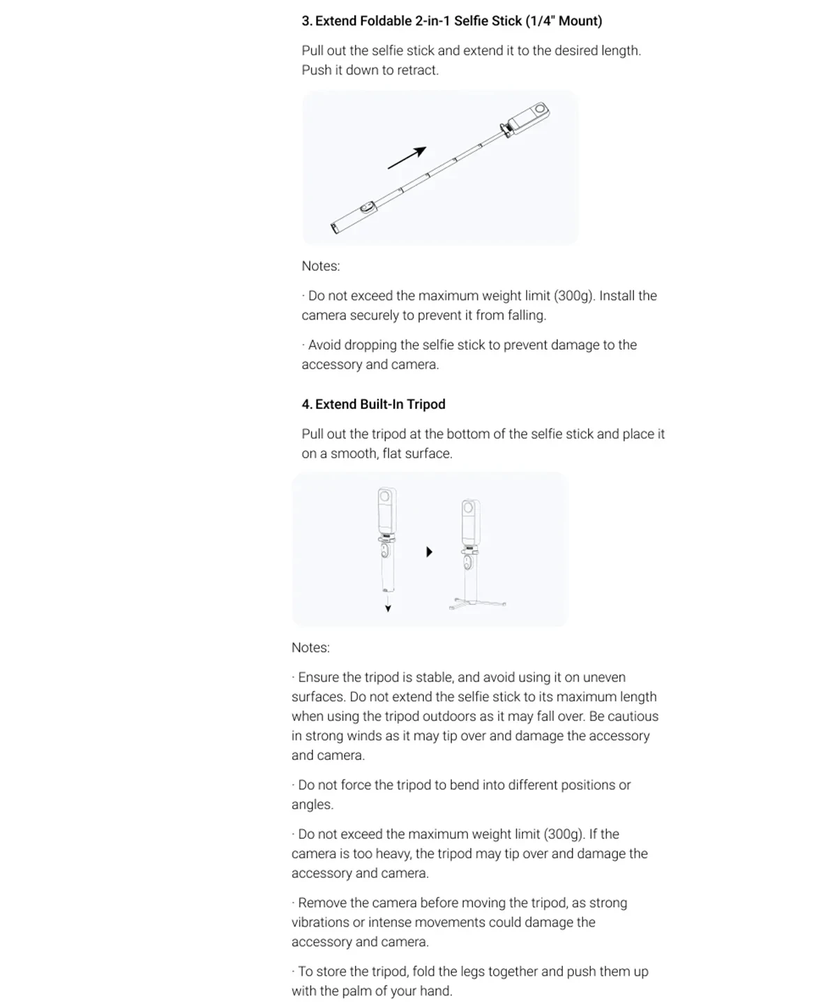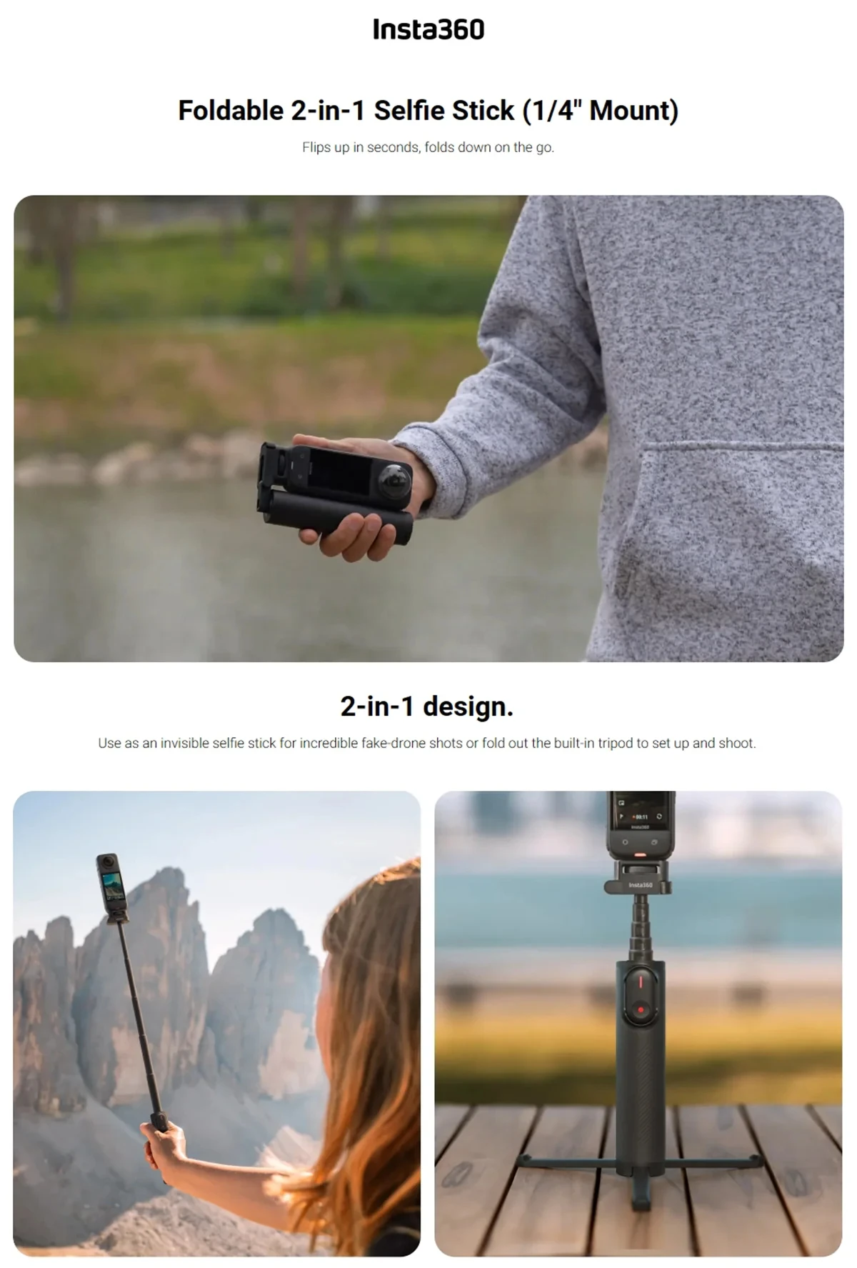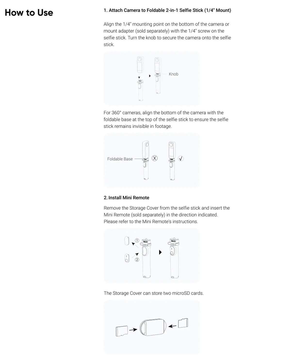 - Model Number:Â Foldable 2-in-1 Selfie Stick (1/4″ Mount)