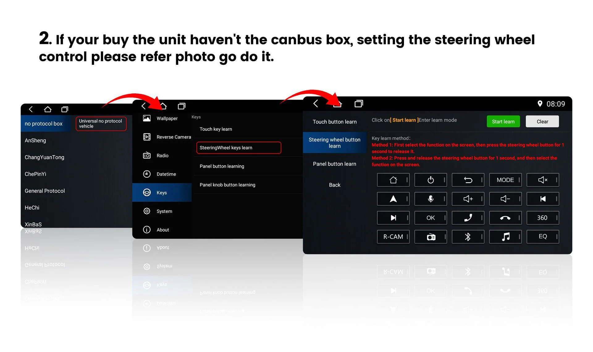 2. if your buy the unit haven’t the canbus box, setting the steering wheel control please refer photo go do it.
