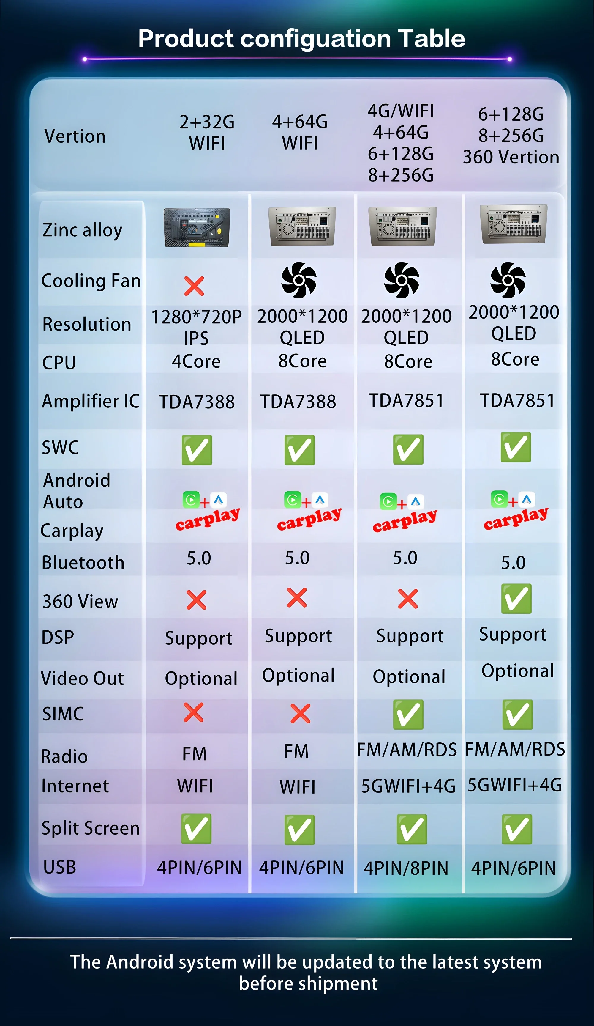 - Special Features: Built-In Speaker/Microphone,wifi function,Support 3G Network,Support 4G Network,Support Can-Bus,Built-in GPS,Mobile Phone,MP3 players,dsp,CarPlay,android auto,Reversing Input,Split Screen,Support steering wheel control