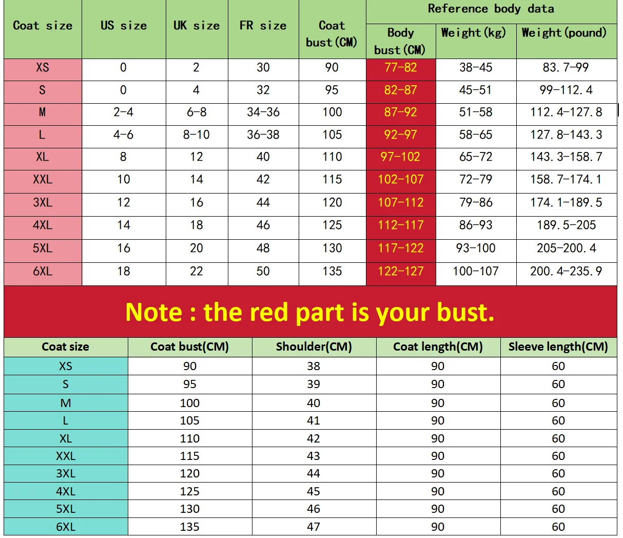 Please careful about the size chart, especially the bust. The table shows the outside parameters of the coat . Individual size should be determined by your bust size plus 6-8 cm, for example if your bust size is 82 cm, 82+8= 90 cm, so take size XS.
