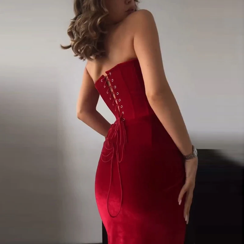 Ladies Temperament Strapless High Waist Party Dress Velvet Backless Tie Up Slim Long Dress New Elegant New Year Evening Dresses
