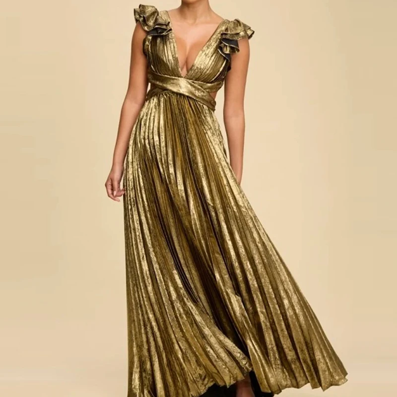 Lady Fashion Draped Waist Swing Long Dress Sexy Backless Bandage Lace-Up Hollow Gown Elegant V-neck Sleeveless Solid Party Dress