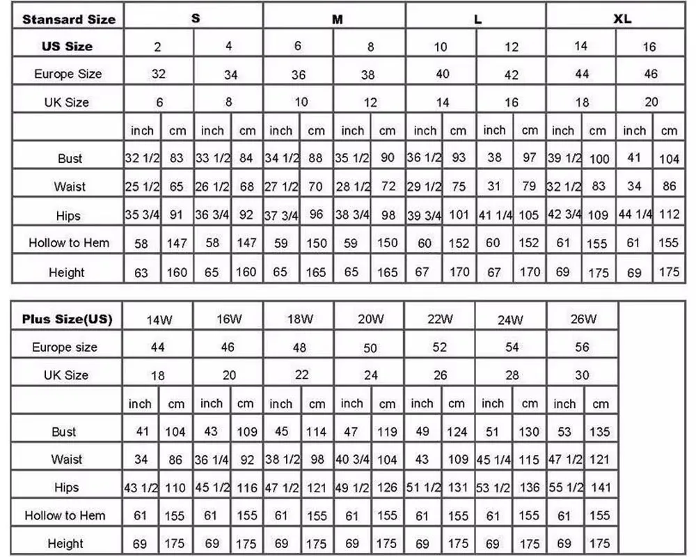 US10 size : Bust: 93 cm, Waist: 75 cm, Hips: 101 cm, Hollow to Floor: 152 cm.