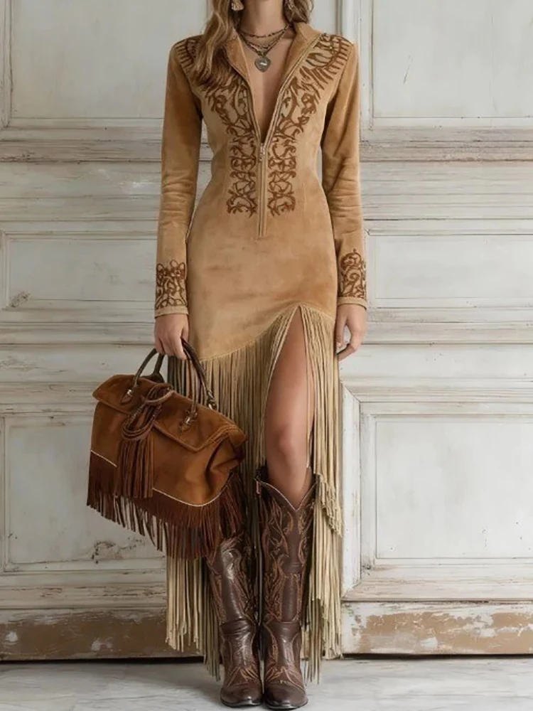 Long Sleeve Tassel Patchwork Maxi Dress, Women Spring Autumn Zipper Stand Collar Party Dress, 2026 Casual Simple Ladies Dresses